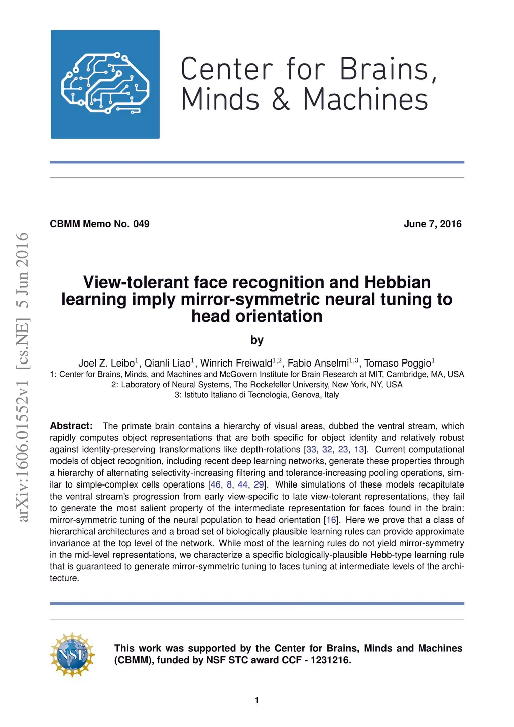 The primate brain contains a hierarchy of visual areas, dubbed the ventral stream, which rapidly computes object representations that are both specific for object identity and relatively robust against identity-preserving transformations like depth-rotations. Current computational models of object recognition, including recent deep learning networks, generate these properties through a hierarchy of alternating selectivity-increasing filtering and tolerance-increasing pooling operations, similar to simple-complex cells operations. While simulations of these models recapitulate the ventral stream's progression from early view-specific to late view-tolerant representations, they fail to generate the most salient property of the intermediate representation for faces found in the brain: mirror-symmetric tuning of the neural population to head orientation. Here we prove that a class of hierarchical architectures and a broad set of biologically plausible learning rules can provide approximate invariance at the top level of the network. While most of the learning rules do not yield mirror-symmetry in the mid-level representations, we characterize a specific biologically-plausible Hebb-type learning rule that is guaranteed to generate mirror-symmetric tuning to faces tuning at intermediate levels of the architecture.
