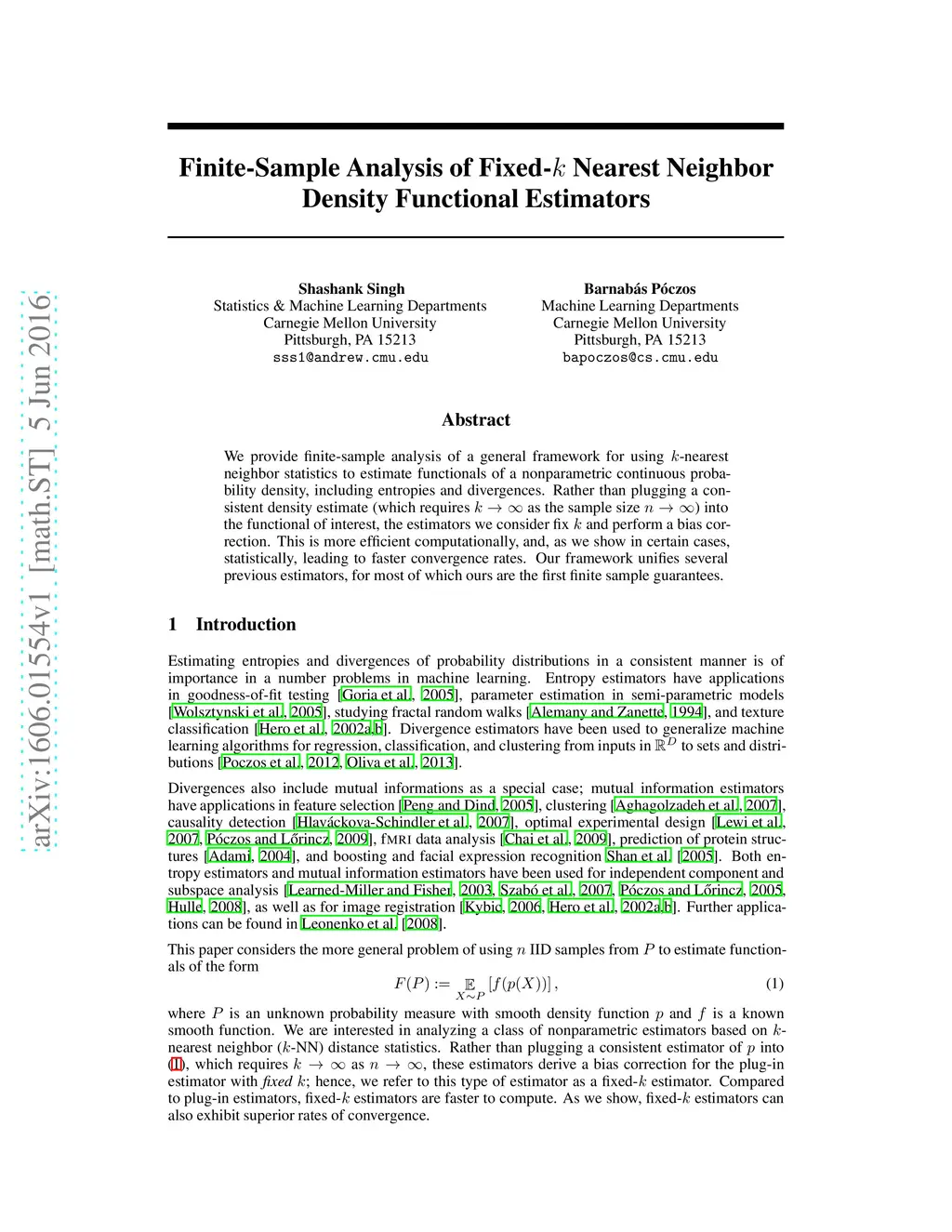 We provide finite-sample analysis of a general framework for using k-nearest neighbor statistics to estimate functionals of a nonparametric continuous probability density, including entropies and divergences. Rather than plugging a consistent density estimate (which requires as the sample size ) into the functional of interest, the estimators we consider fix k and perform a bias correction. This is more efficient computationally, and, as we show in certain cases, statistically, leading to faster convergence rates. Our framework unifies several previous estimators, for most of which ours are the first finite sample guarantees.