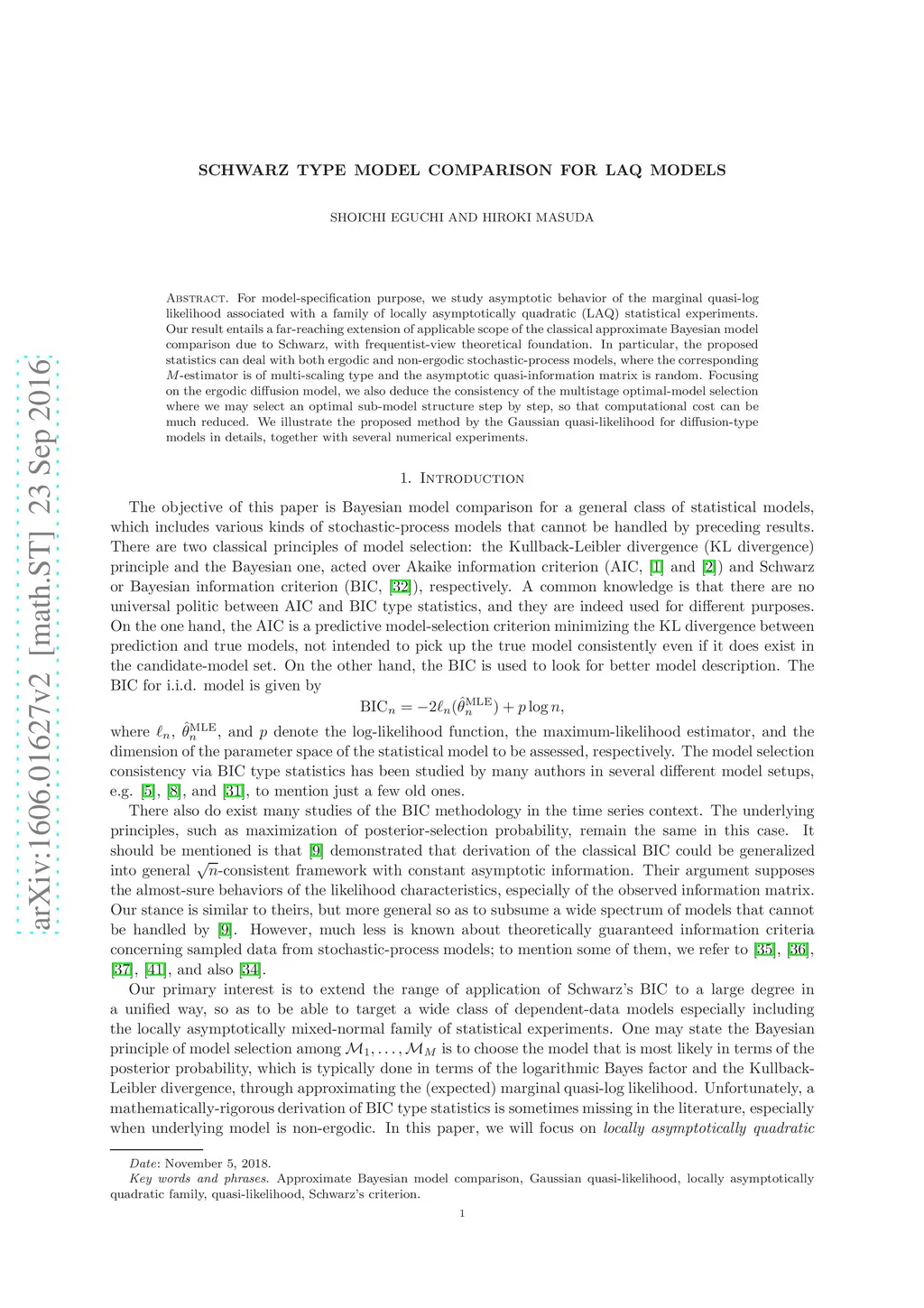 For model-specification purpose, we study asymptotic behavior of the marginal quasi-log likelihood associated with a family of locally asymptotically quadratic (LAQ) statistical experiments. Our result entails a far-reaching extension of applicable scope of the classical approximate Bayesian model comparison due to Schwarz, with frequentist-view theoretical foundation. In particular, the proposed statistics can deal with both ergodic and non-ergodic stochastic-process models, where the corresponding -estimator is of multi-scaling type and the asymptotic quasi-information matrix is random. Focusing on the ergodic diffusion model, we also deduce the consistency of the multistage optimal-model selection where we may select an optimal sub-model structure step by step, so that computational cost can be much reduced. We illustrate the proposed method by the Gaussian quasi-likelihood for diffusion-type models in details, together with several numerical experiments.