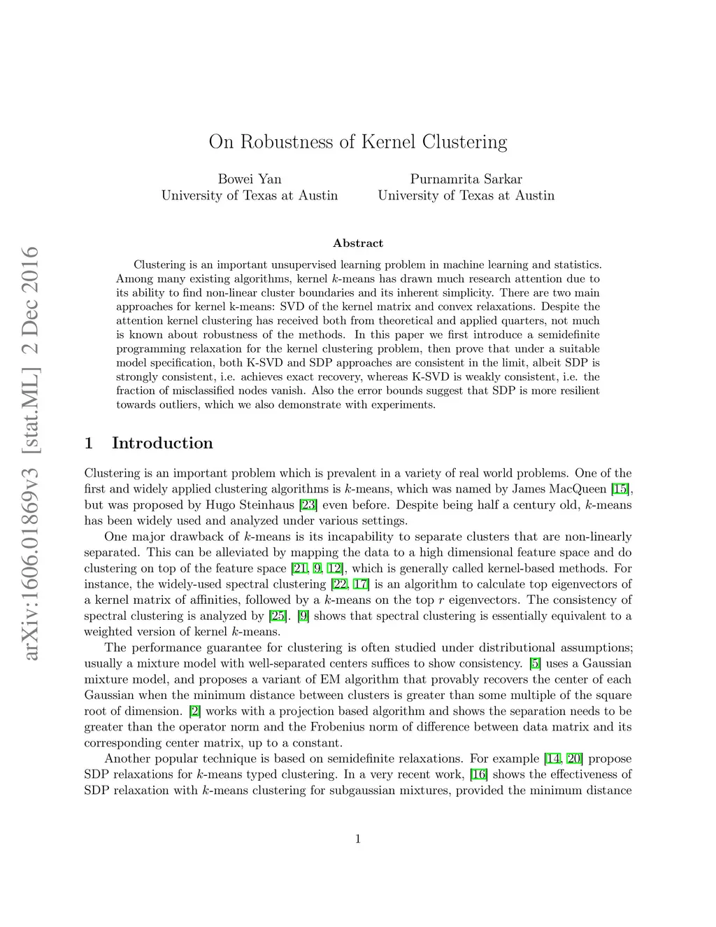 Clustering is one of the most important unsupervised problems in machine learning and statistics. Among many existing algorithms, kernel k-means has drawn much research attention due to its ability to find non-linear cluster boundaries and its inherent simplicity. There are two main approaches for kernel k-means: SVD of the kernel matrix and convex relaxations. Despite the attention kernel clustering has received both from theoretical and applied quarters, not much is known about robustness of the methods. In this paper we first introduce a semidefinite programming relaxation for the kernel clustering problem, then prove that under a suitable model specification, both the K-SVD and SDP approaches are consistent in the limit, albeit SDP is strongly consistent, i.e. achieves exact recovery, whereas K-SVD is weakly consistent, i.e. the fraction of misclassified nodes vanish.