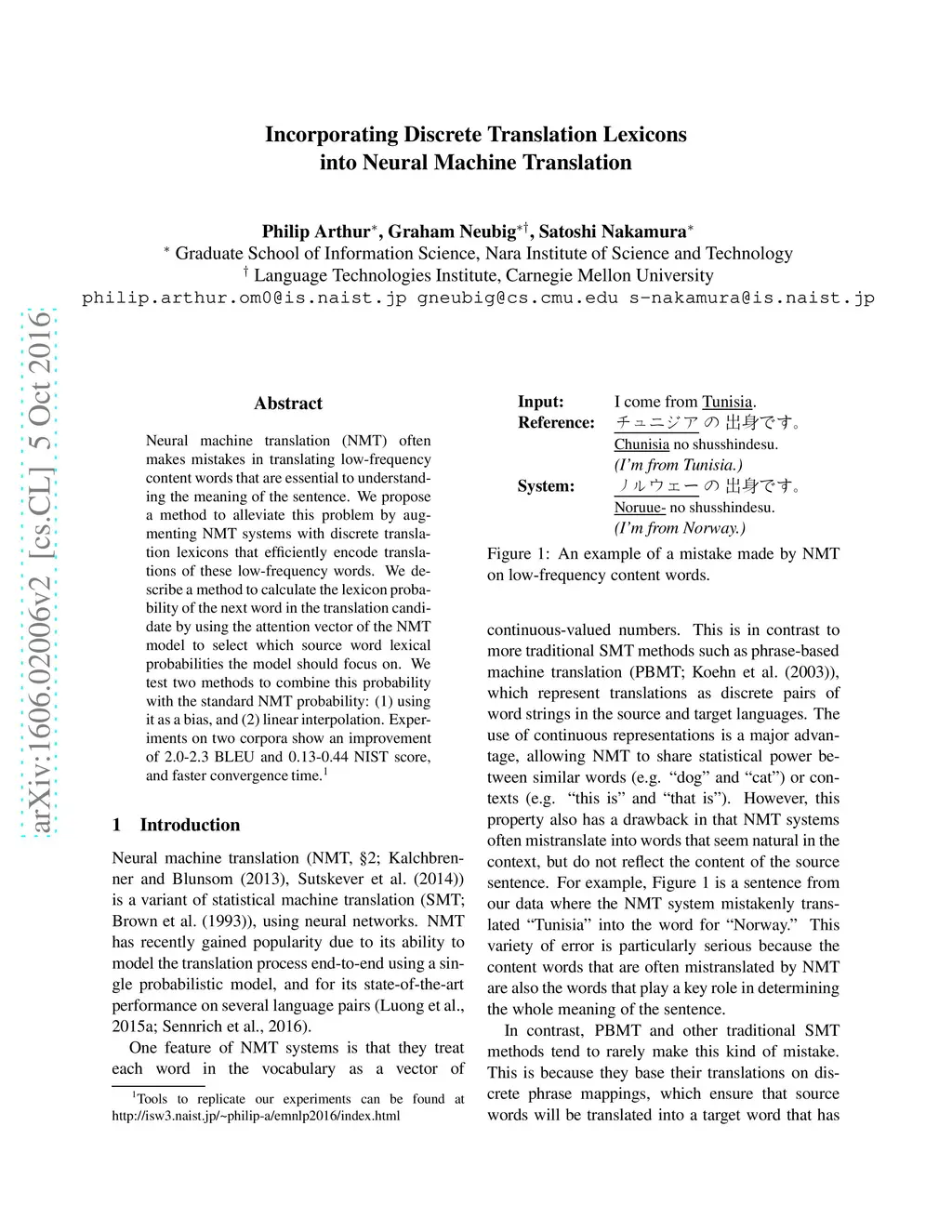 Incorporating Discrete Translation Lexicons into Neural Machine