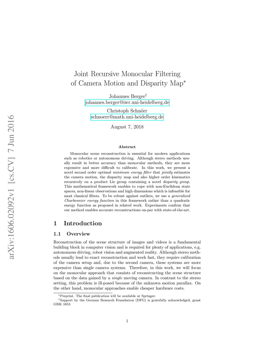 Monocular scene reconstruction is essential for modern applications such as robotics or autonomous driving. Although stereo methods usually result in better accuracy than monocular methods, they are more expensive and more difficult to calibrate. In this work, we present a novel second order optimal minimum energy filter that jointly estimates the camera motion, the disparity map and also higher order kinematics recursively on a product Lie group containing a novel disparity group. This mathematical framework enables to cope with non-Euclidean state spaces, non-linear observations and high dimensions which is infeasible for most classical filters. To be robust against outliers, we use a generalized Charbonnier energy function in this framework rather than a quadratic energy function as proposed in related work. Experiments confirm that our method enables accurate reconstructions on-par with state-of-the-art.