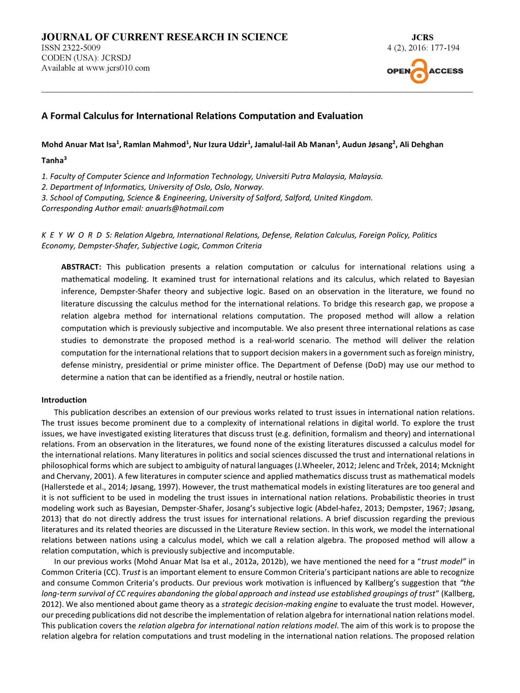 This publication presents a relation computation or calculus for international relations using a mathematical modeling. It examined trust for international relations and its calculus, which related to Bayesian inference, Dempster-Shafer theory and subjective logic. Based on an observation in the literature, we found no literature discussing the calculus method for the international relations. To bridge this research gap, we propose a relation algebra method for international relations computation. The proposed method will allow a relation computation which is previously subjective and incomputable. We also present three international relations as case studies to demonstrate the proposed method is a real-world scenario. The method will deliver the relation computation for the international relations that to support decision makers in a government such as foreign ministry, defense ministry, presidential or prime minister office. The Department of Defense (DoD) may use our method to determine a nation that can be identified as a friendly, neutral or hostile nation.