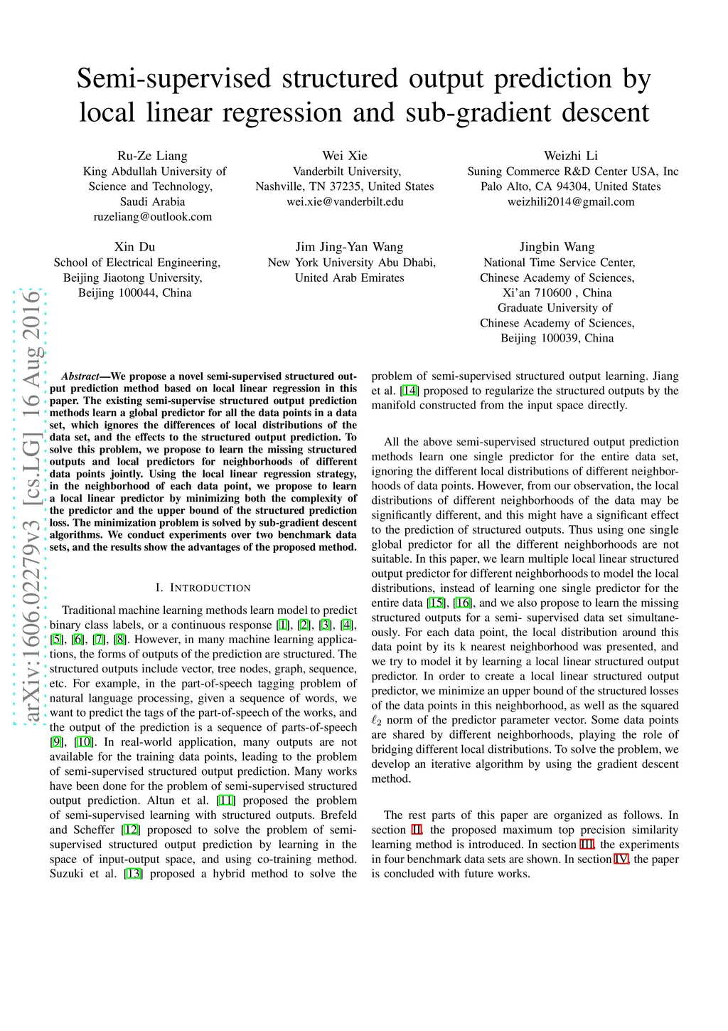 We propose a novel semi-supervised structured output prediction method based on local linear regression in this paper. The existing semi-supervise structured output prediction methods learn a global predictor for all the data points in a data set, which ignores the differences of local distributions of the data set, and the effects to the structured output prediction. To solve this problem, we propose to learn the missing structured outputs and local predictors for neighborhoods of different data points jointly. Using the local linear regression strategy, in the neighborhood of each data point, we propose to learn a local linear predictor by minimizing both the complexity of the predictor and the upper bound of the structured prediction loss. The minimization problem is solved by sub-gradient descent algorithms. We conduct experiments over two benchmark data sets, and the results show the advantages of the proposed method.