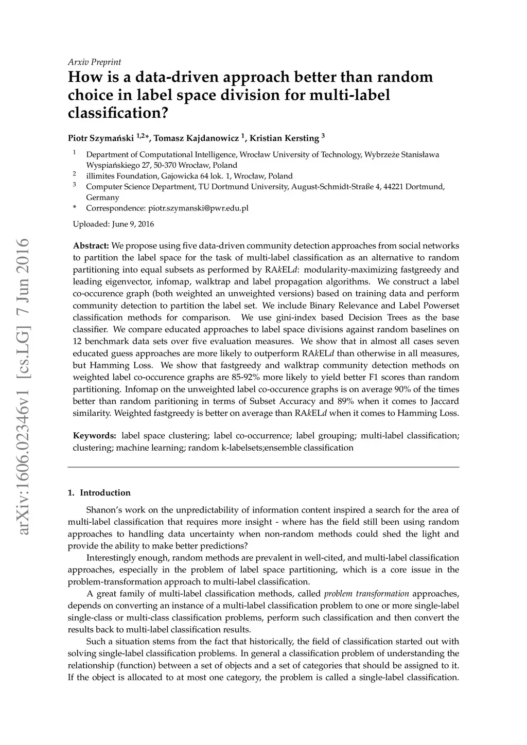 We propose using five data-driven community detection approaches from social networks to partition the label space for the task of multi-label classification as an alternative to random partitioning into equal subsets as performed by RAkELd: modularity-maximizing fastgreedy and leading eigenvector, infomap, walktrap and label propagation algorithms. We construct a label co-occurence graph (both weighted an unweighted versions) based on training data and perform community detection to partition the label set. We include Binary Relevance and Label Powerset classification methods for comparison. We use gini-index based Decision Trees as the base classifier. We compare educated approaches to label space divisions against random baselines on 12 benchmark data sets over five evaluation measures. We show that in almost all cases seven educated guess approaches are more likely to outperform RAkELd than otherwise in all measures, but Hamming Loss. We show that fastgreedy and walktrap community detection methods on weighted label co-occurence graphs are 85-92% more likely to yield better F1 scores than random partitioning. Infomap on the unweighted label co-occurence graphs is on average 90% of the times better than random paritioning in terms of Subset Accuracy and 89% when it comes to Jaccard similarity. Weighted fastgreedy is better on average than RAkELd when it comes to Hamming Loss.