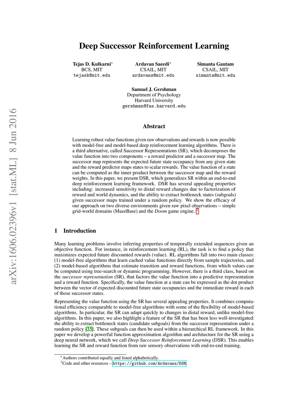 Learning robust value functions given raw observations and rewards is now possible with model-free and model-based deep reinforcement learning algorithms. There is a third alternative, called Successor Representations (SR), which decomposes the value function into two components -- a reward predictor and a successor map. The successor map represents the expected future state occupancy from any given state and the reward predictor maps states to scalar rewards. The value function of a state can be computed as the inner product between the successor map and the reward weights. In this paper, we present DSR, which generalizes SR within an end-to-end deep reinforcement learning framework. DSR has several appealing properties including: increased sensitivity to distal reward changes due to factorization of reward and world dynamics, and the ability to extract bottleneck states (subgoals) given successor maps trained under a random policy. We show the efficacy of our approach on two diverse environments given raw pixel observations -- simple grid-world domains (MazeBase) and the Doom game engine.