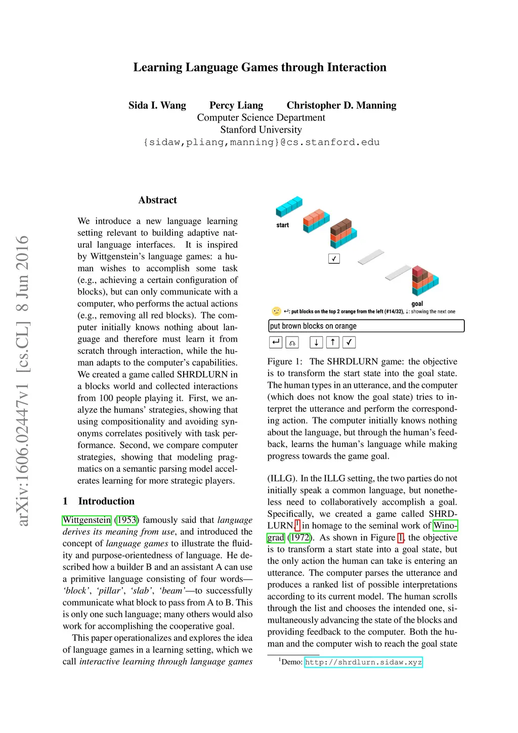 We introduce a new language learning setting relevant to building adaptive natural language interfaces. It is inspired by Wittgenstein's language games: a human wishes to accomplish some task (e.g., achieving a certain configuration of blocks), but can only communicate with a computer, who performs the actual actions (e.g., removing all red blocks). The computer initially knows nothing about language and therefore must learn it from scratch through interaction, while the human adapts to the computer's capabilities. We created a game in a blocks world and collected interactions from 100 people playing it. First, we analyze the humans' strategies, showing that using compositionality and avoiding synonyms correlates positively with task performance. Second, we compare computer strategies, showing how to quickly learn a semantic parsing model from scratch, and that modeling pragmatics further accelerates learning for successful players.