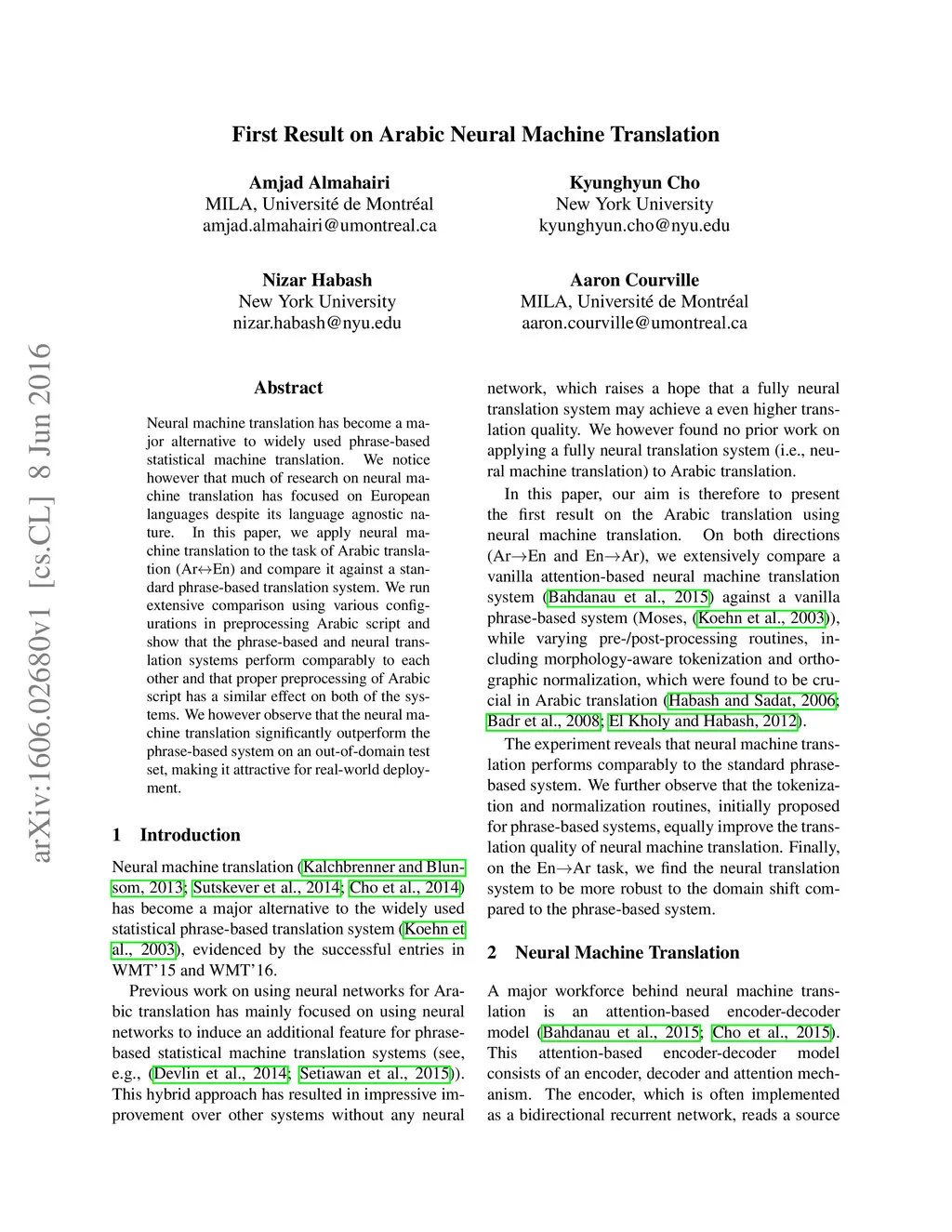 Neural machine translation has become a major alternative to widely used phrase-based statistical machine translation. We notice however that much of research on neural machine translation has focused on European languages despite its language agnostic nature. In this paper, we apply neural machine translation to the task of Arabic translation (Ar<->En) and compare it against a standard phrase-based translation system. We run extensive comparison using various configurations in preprocessing Arabic script and show that the phrase-based and neural translation systems perform comparably to each other and that proper preprocessing of Arabic script has a similar effect on both of the systems. We however observe that the neural machine translation significantly outperform the phrase-based system on an out-of-domain test set, making it attractive for real-world deployment.