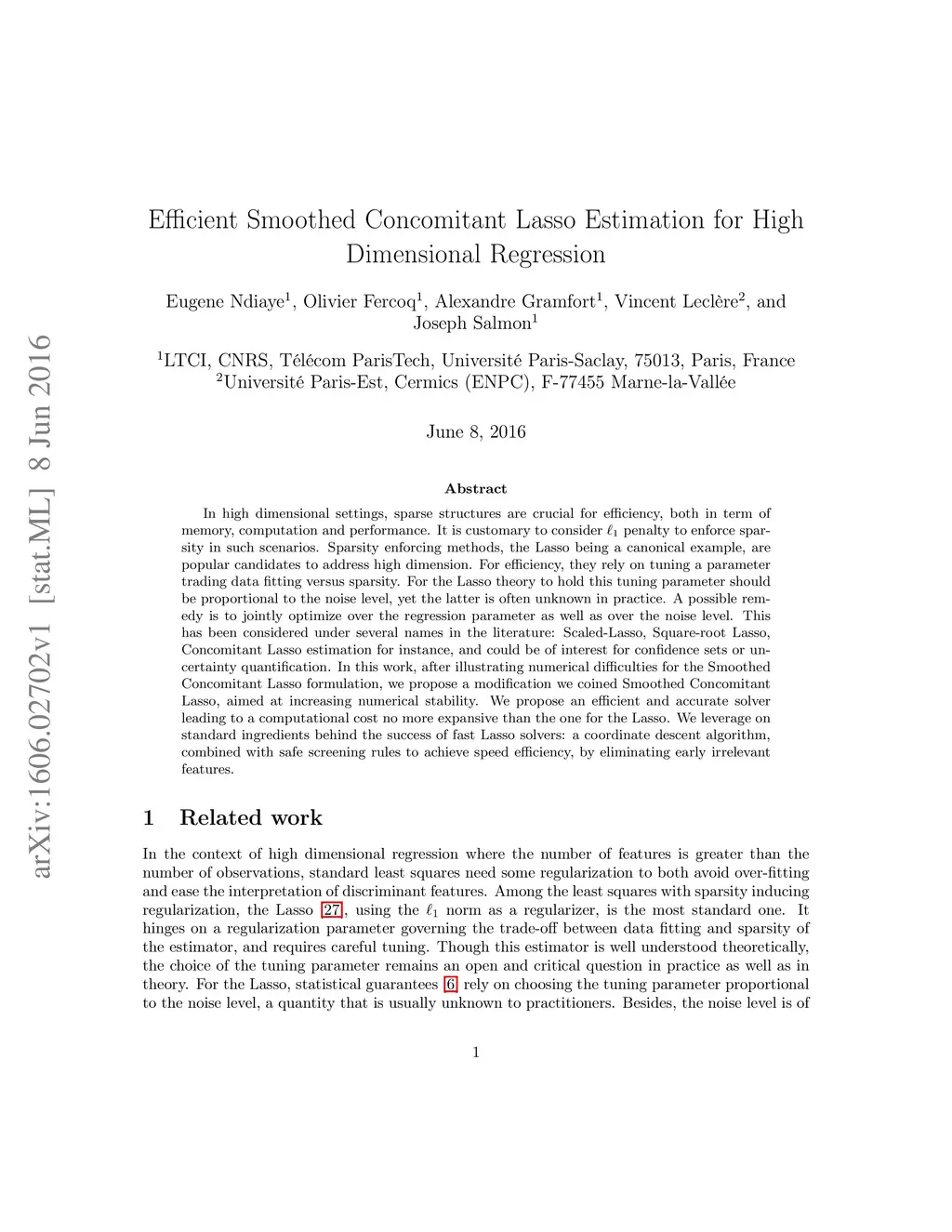 In high dimensional settings, sparse structures are crucial for efficiency, both in term of memory, computation and performance. It is customary to consider penalty to enforce sparsity in such scenarios. Sparsity enforcing methods, the Lasso being a canonical example, are popular candidates to address high dimension. For efficiency, they rely on tuning a parameter trading data fitting versus sparsity. For the Lasso theory to hold this tuning parameter should be proportional to the noise level, yet the latter is often unknown in practice. A possible remedy is to jointly optimize over the regression parameter as well as over the noise level. This has been considered under several names in the literature: Scaled-Lasso, Square-root Lasso, Concomitant Lasso estimation for instance, and could be of interest for confidence sets or uncertainty quantification. In this work, after illustrating numerical difficulties for the Smoothed Concomitant Lasso formulation, we propose a modification we coined Smoothed Concomitant Lasso, aimed at increasing numerical stability. We propose an efficient and accurate solver leading to a computational cost no more expansive than the one for the Lasso. We leverage on standard ingredients behind the success of fast Lasso solvers: a coordinate descent algorithm, combined with safe screening rules to achieve speed efficiency, by eliminating early irrelevant features.