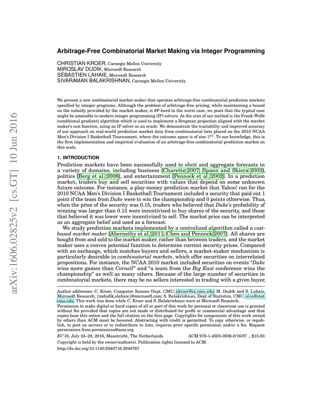 We present a new combinatorial market maker that operates arbitrage-free combinatorial prediction markets specified by integer programs. Although the problem of arbitrage-free pricing, while maintaining a bound on the subsidy provided by the market maker, is #P-hard in the worst case, we posit that the typical case might be amenable to modern integer programming (IP) solvers. At the crux of our method is the Frank-Wolfe (conditional gradient) algorithm which is used to implement a Bregman projection aligned with the market maker's cost function, using an IP solver as an oracle. We demonstrate the tractability and improved accuracy of our approach on real-world prediction market data from combinatorial bets placed on the 2010 NCAA Men's Division I Basketball Tournament, where the outcome space is of size 2^63. To our knowledge, this is the first implementation and empirical evaluation of an arbitrage-free combinatorial prediction market on this scale.