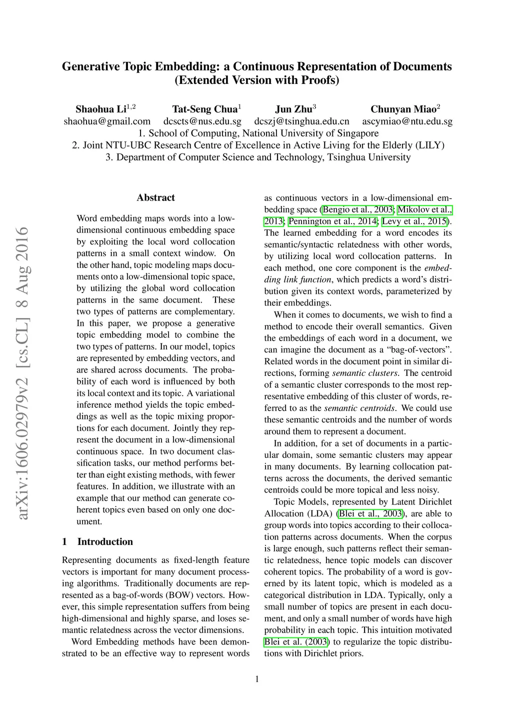 Word embedding maps words into a low-dimensional continuous embedding space by exploiting the local word collocation patterns in a small context window. On the other hand, topic modeling maps documents onto a low-dimensional topic space, by utilizing the global word collocation patterns in the same document. These two types of patterns are complementary. In this paper, we propose a generative topic embedding model to combine the two types of patterns. In our model, topics are represented by embedding vectors, and are shared across documents. The probability of each word is influenced by both its local context and its topic. A variational inference method yields the topic embeddings as well as the topic mixing proportions for each document. Jointly they represent the document in a low-dimensional continuous space. In two document classification tasks, our method performs better than eight existing methods, with fewer features. In addition, we illustrate with an example that our method can generate coherent topics even based on only one document.