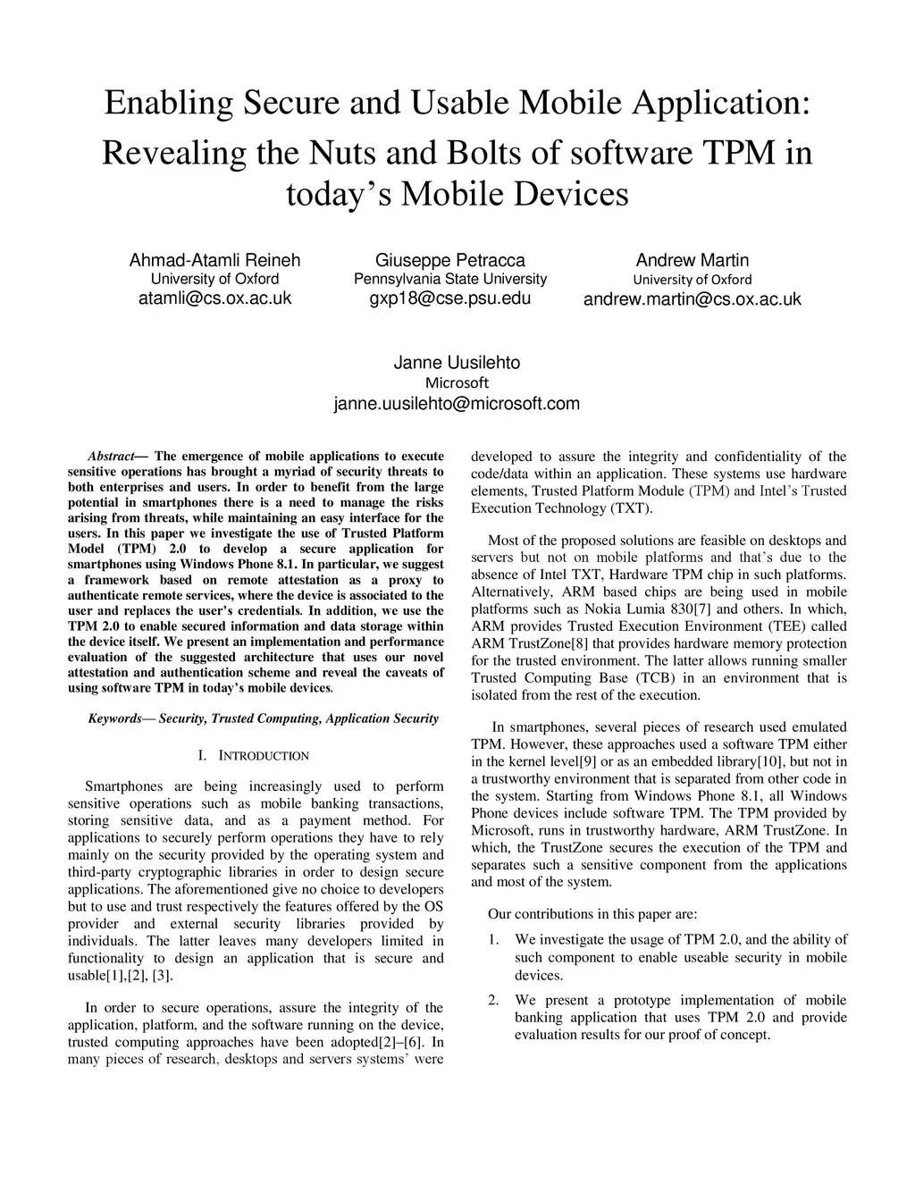 The emergence of mobile applications to execute sensitive operations has brought a myriad of security threats to both enterprises and users. In order to benefit from the large potential in smartphones there is a need to manage the risks arising from threats, while maintaining an easy interface for the users. In this paper we investigate the use of Trusted Platform Model (TPM) 2.0 to develop a secure application for smartphones using Windows Phone 8.1. In particular, we suggest a framework based on remote attestation as a proxy to authenticate remote services, where the device is associated to the user and replaces the users credentials. In addition, we use the TPM 2.0 to enable secured information and data storage within the device itself. We present an implementation and performance evaluation of the suggested architecture that uses our novel attestation and authentication scheme and reveal the caveats of using software TPM in todays mobile devices.