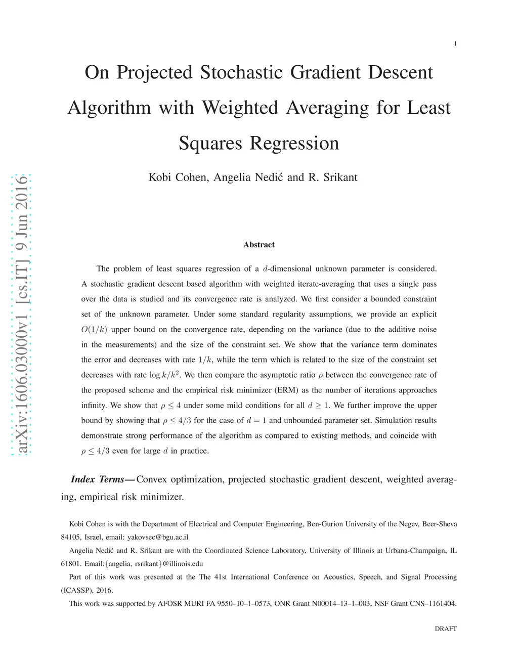The problem of least squares regression of a -dimensional unknown parameter is considered. A stochastic gradient descent based algorithm with weighted iterate-averaging that uses a single pass over the data is studied and its convergence rate is analyzed. We first consider a bounded constraint set of the unknown parameter. Under some standard regularity assumptions, we provide an explicit upper bound on the convergence rate, depending on the variance (due to the additive noise in the measurements) and the size of the constraint set. We show that the variance term dominates the error and decreases with rate , while the term which is related to the size of the constraint set decreases with rate . We then compare the asymptotic ratio between the convergence rate of the proposed scheme and the empirical risk minimizer (ERM) as the number of iterations approaches infinity. We show that under some mild conditions for all . We further improve the upper bound by showing that for the case of and unbounded parameter set. Simulation results demonstrate strong performance of the algorithm as compared to existing methods, and coincide with even for large in practice.
