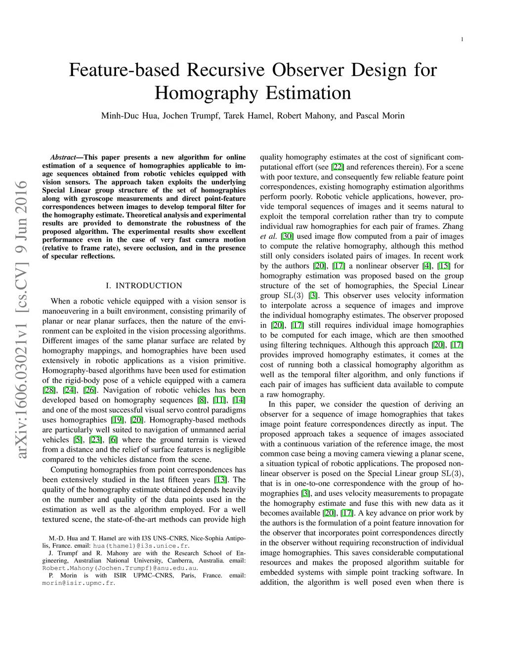 This paper presents a new algorithm for online estimation of a sequence of homographies applicable to image sequences obtained from robotic vehicles equipped with vision sensors. The approach taken exploits the underlying Special Linear group structure of the set of homographies along with gyroscope measurements and direct point-feature correspondences between images to develop temporal filter for the homography estimate. Theoretical analysis and experimental results are provided to demonstrate the robustness of the proposed algorithm. The experimental results show excellent performance even in the case of very fast camera motion (relative to frame rate), severe occlusion, and in the presence of specular reflections.