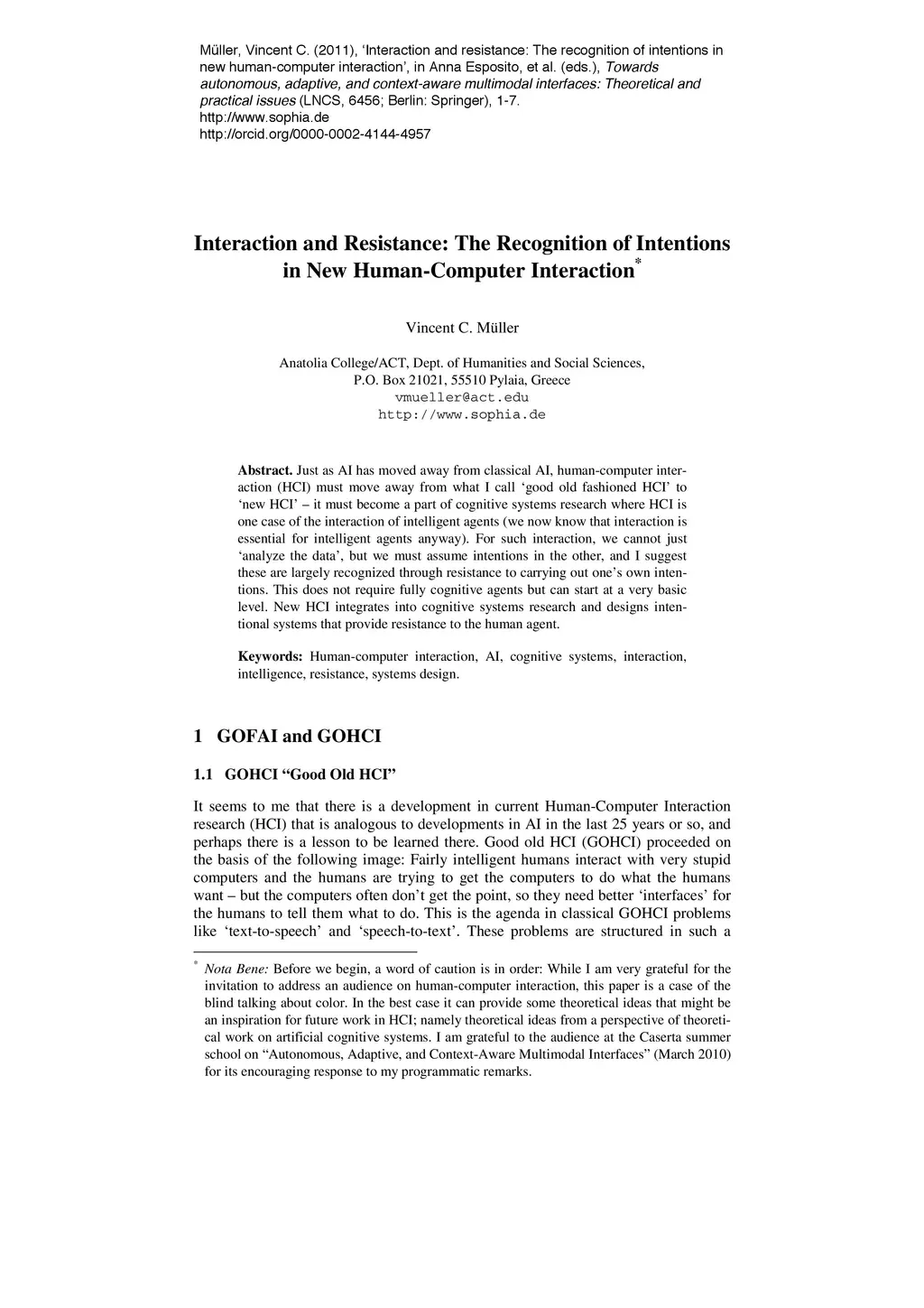 Just as AI has moved away from classical AI, human-computer interaction (HCI) must move away from what I call 'good old fashioned HCI' to ñew HCI' - it must become a part of cognitive systems research where HCI is one case of the interaction of intelligent agents (we now know that interaction is essential for intelligent agents anyway). For such interaction, we cannot just ánalyze the data', but we must assume intentions in the other, and I suggest these are largely recognized through resistance to carrying out one's own intentions. This does not require fully cognitive agents but can start at a very basic level. New HCI integrates into cognitive systems research and designs intentional systems that provide resistance to the human agent.