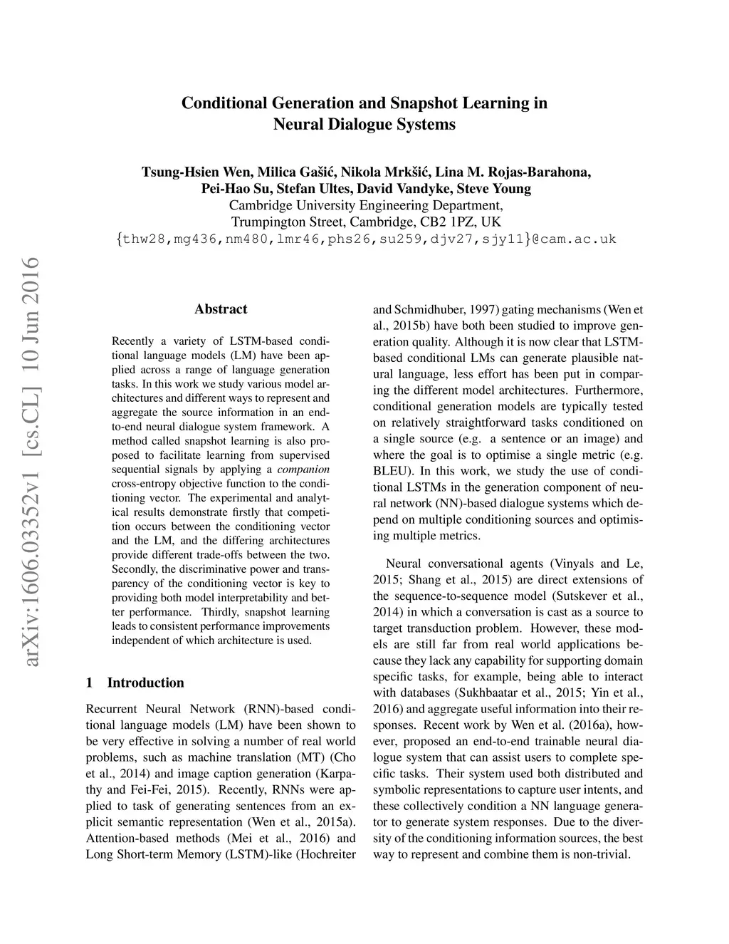 Conditional Generation and Snapshot Learning in Neural Dialogue Systems