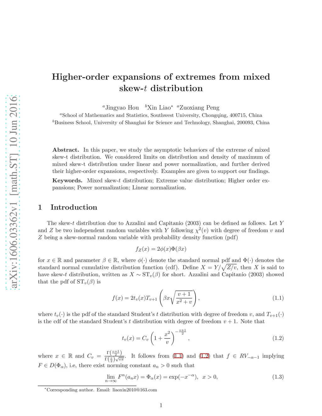 In this paper, we study the asymptotic behaviors of the extreme of mixed skew-t distribution. We considered limits on distribution and density of maximum of mixed skew-t distribution under linear and power normalization, and further derived their higher-order expansions, respectively. Examples are given to support our findings.