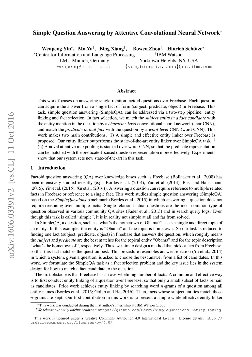 Simple Question Answering by Attentive Convolutional Neural Network