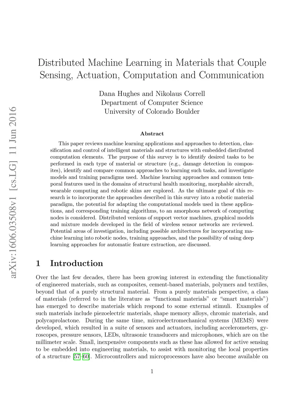 This paper reviews machine learning applications and approaches to detection, classification and control of intelligent materials and structures with embedded distributed computation elements. The purpose of this survey is to identify desired tasks to be performed in each type of material or structure (e.g., damage detection in composites), identify and compare common approaches to learning such tasks, and investigate models and training paradigms used. Machine learning approaches and common temporal features used in the domains of structural health monitoring, morphable aircraft, wearable computing and robotic skins are explored. As the ultimate goal of this research is to incorporate the approaches described in this survey into a robotic material paradigm, the potential for adapting the computational models used in these applications, and corresponding training algorithms, to an amorphous network of computing nodes is considered. Distributed versions of support vector machines, graphical models and mixture models developed in the field of wireless sensor networks are reviewed. Potential areas of investigation, including possible architectures for incorporating machine learning into robotic nodes, training approaches, and the possibility of using deep learning approaches for automatic feature extraction, are discussed.