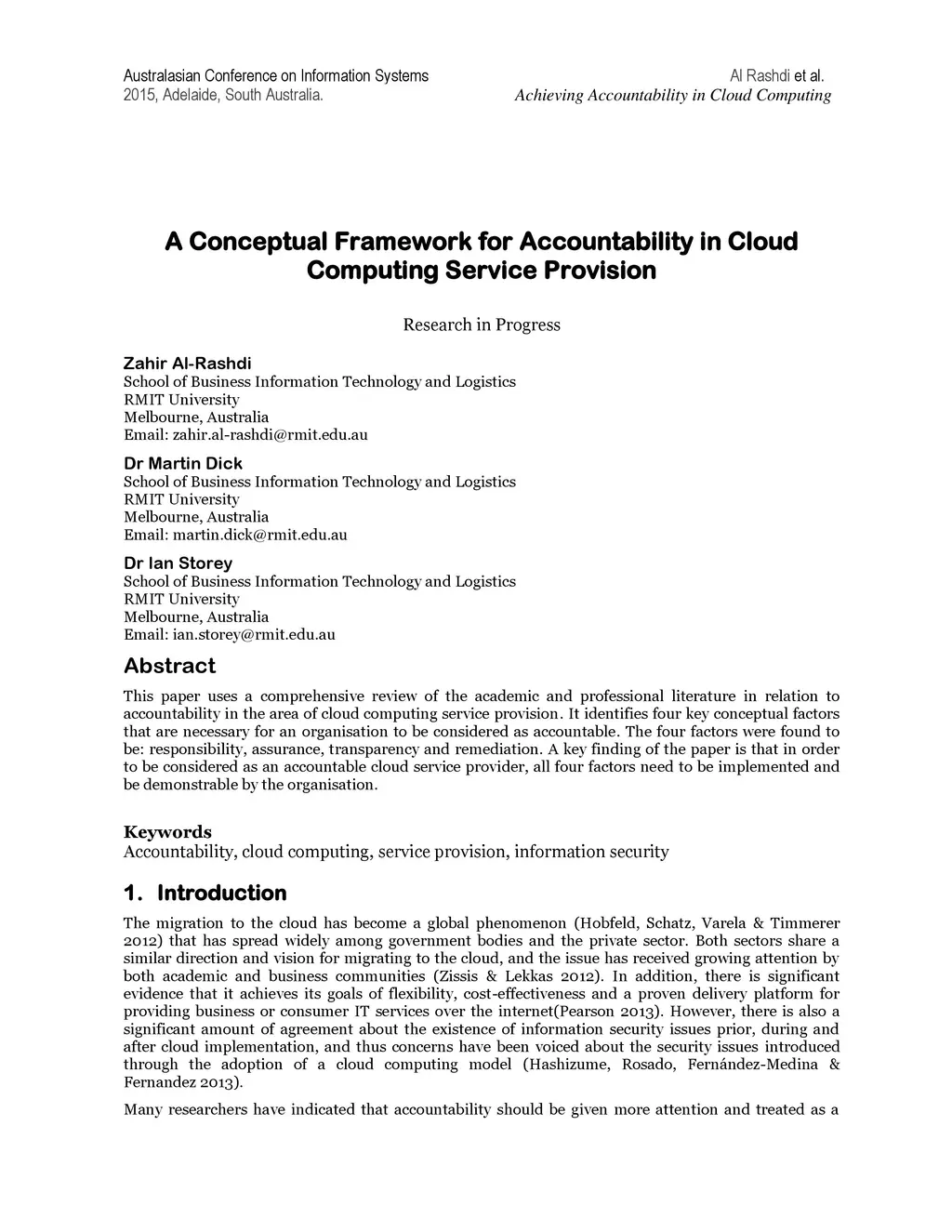 This paper uses a comprehensive review of the academic and professional literature in relation to accountability in the area of cloud computing service provision. It identifies four key conceptual factors that are necessary for an organisation to be considered as accountable. The four factors were found to be: responsibility, assurance, transparency and remediation. A key finding of the paper is that in order to be considered as an accountable cloud service provider, all four factors need to be implemented and be demonstrable by the organisation.