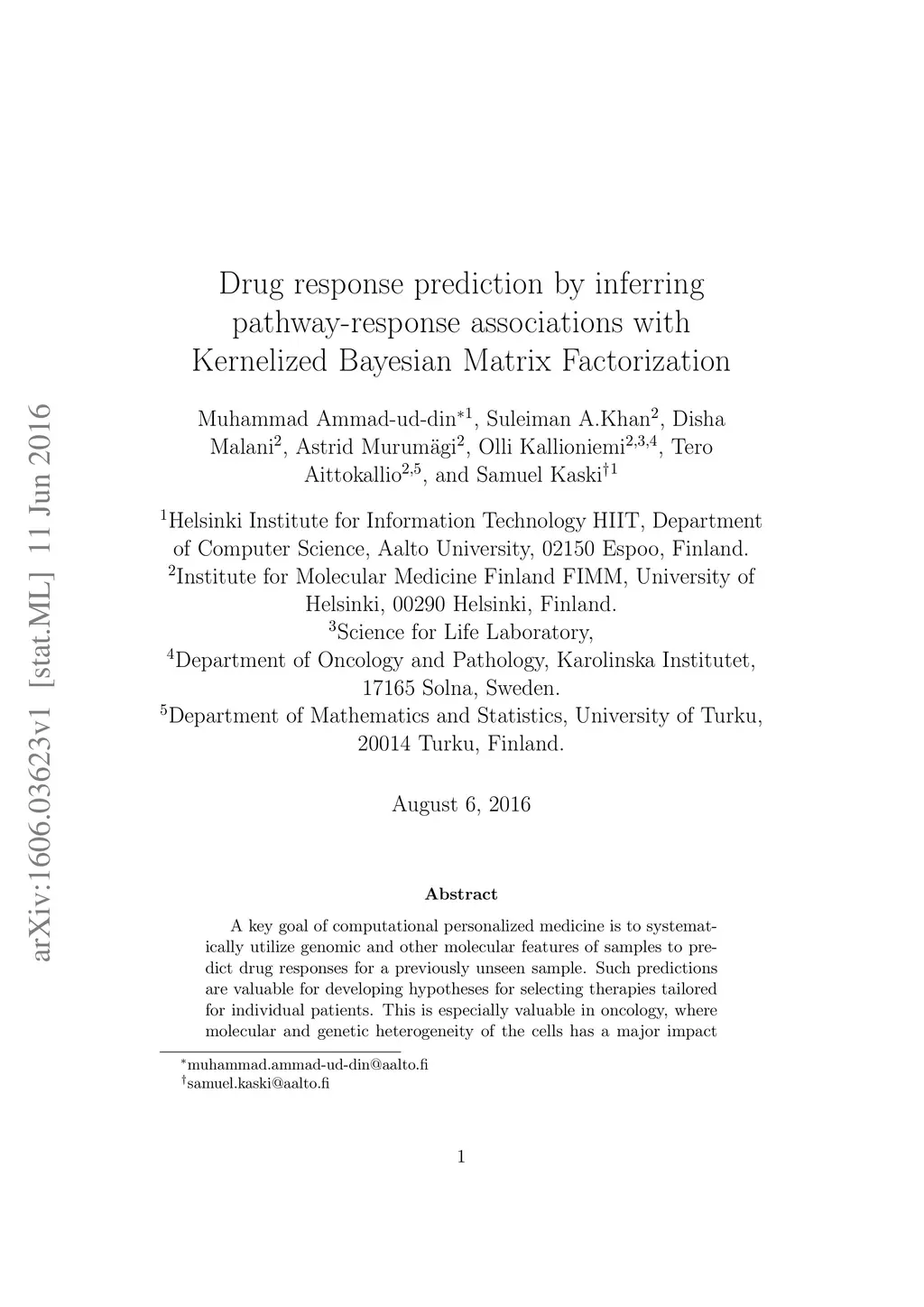A key goal of computational personalized medicine is to systematically utilize genomic and other molecular features of samples to predict drug responses for a previously unseen sample. Such predictions are valuable for developing hypotheses for selecting therapies tailored for individual patients. This is especially valuable in oncology, where molecular and genetic heterogeneity of the cells has a major impact on the response. However, the prediction task is extremely challenging, raising the need for methods that can effectively model and predict drug responses. In this study, we propose a novel formulation of multi-task matrix factorization that allows selective data integration for predicting drug responses. To solve the modeling task, we extend the state-of-the-art kernelized Bayesian matrix factorization (KBMF) method with component-wise multiple kernel learning. In addition, our approach exploits the known pathway information in a novel and biologically meaningful fashion to learn the drug response associations. Our method quantitatively outperforms the state of the art on predicting drug responses in two publicly available cancer data sets as well as on a synthetic data set. In addition, we validated our model predictions with lab experiments using an in-house cancer cell line panel. We finally show the practical applicability of the proposed method by utilizing prior knowledge to infer pathway-drug response associations, opening up the opportunity for elucidating drug action mechanisms. We demonstrate that pathway-response associations can be learned by the proposed model for the well known EGFR and MEK inhibitors.