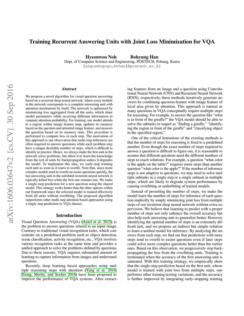 We propose a novel algorithm for visual question answering based on a recurrent deep neural network, where every module in the network corresponds to a complete answering unit with attention mechanism by itself. The network is optimized by minimizing loss aggregated from all the units, which share model parameters while receiving different information to compute attention probability. For training, our model attends to a region within image feature map, updates its memory based on the question and attended image feature, and answers the question based on its memory state. This procedure is performed to compute loss in each step. The motivation of this approach is our observation that multi-step inferences are often required to answer questions while each problem may have a unique desirable number of steps, which is difficult to identify in practice. Hence, we always make the first unit in the network solve problems, but allow it to learn the knowledge from the rest of units by backpropagation unless it degrades the model. To implement this idea, we early-stop training each unit as soon as it starts to overfit. Note that, since more complex models tend to overfit on easier questions quickly, the last answering unit in the unfolded recurrent neural network is typically killed first while the first one remains last. We make a single-step prediction for a new question using the shared model. This strategy works better than the other options within our framework since the selected model is trained effectively from all units without overfitting. The proposed algorithm outperforms other multi-step attention based approaches using a single step prediction in VQA dataset.