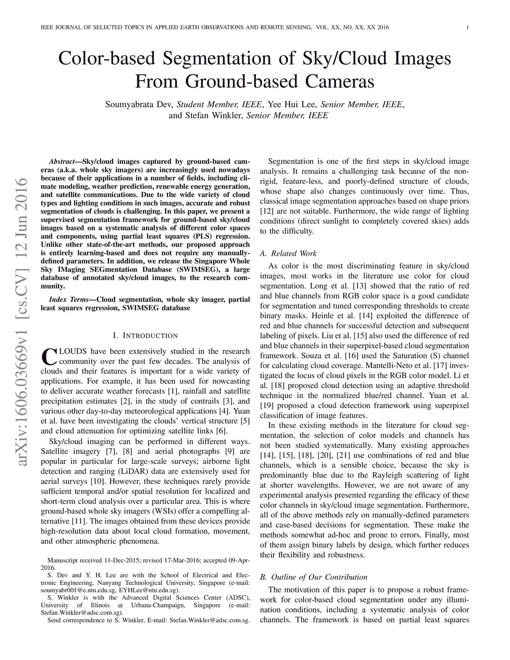Sky/cloud images captured by ground-based cameras (a.k.a. whole sky imagers) are increasingly used nowadays because of their applications in a number of fields, including climate modeling, weather prediction, renewable energy generation, and satellite communications. Due to the wide variety of cloud types and lighting conditions in such images, accurate and robust segmentation of clouds is challenging. In this paper, we present a supervised segmentation framework for ground-based sky/cloud images based on a systematic analysis of different color spaces and components, using partial least squares (PLS) regression. Unlike other state-of-the-art methods, our proposed approach is entirely learning-based and does not require any manually-defined parameters. In addition, we release the Singapore Whole Sky IMaging SEGmentation Database (SWIMSEG), a large database of annotated sky/cloud images, to the research community.