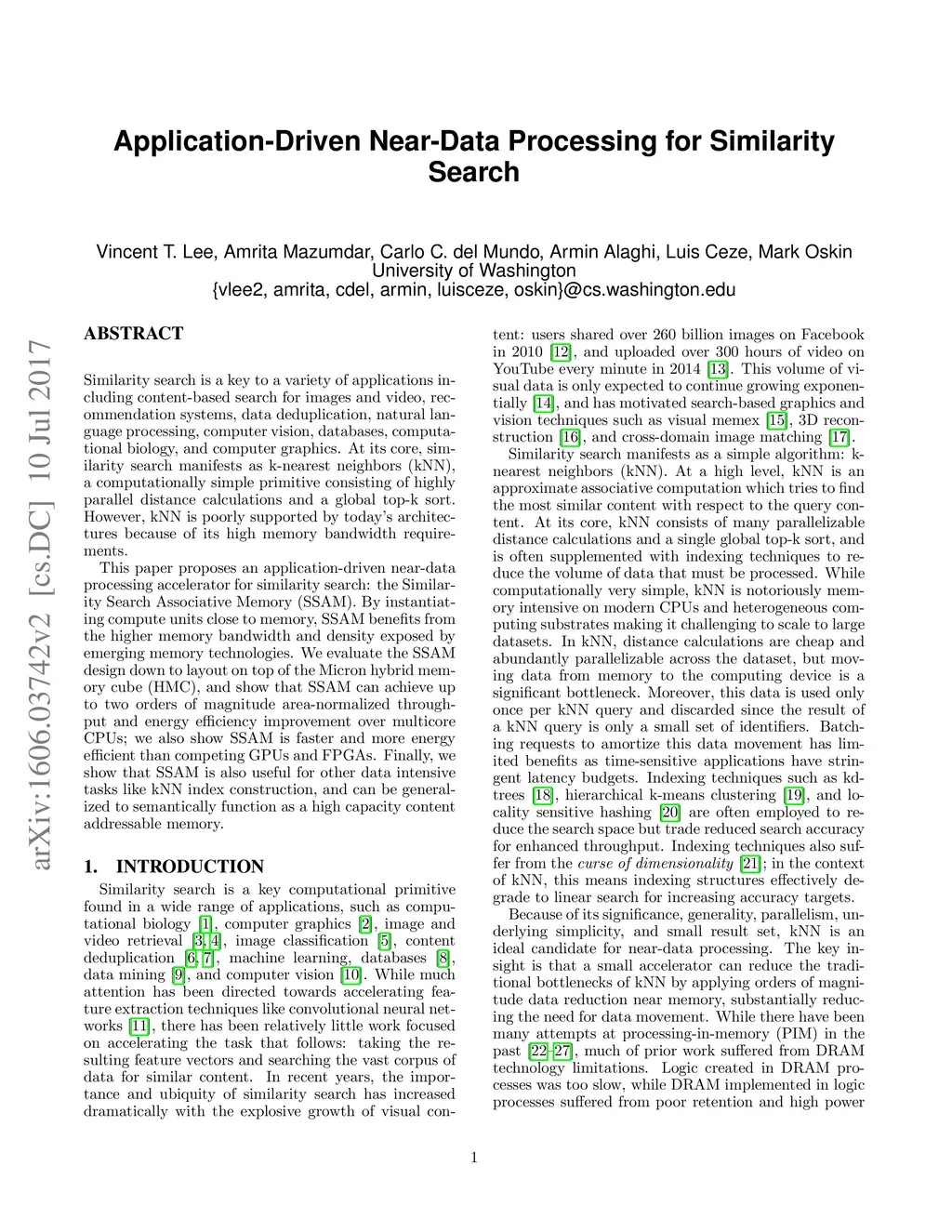 Similarity search is a key to a variety of applications including content-based search for images and video, recommendation systems, data deduplication, natural language processing, computer vision, databases, computational biology, and computer graphics. At its core, similarity search manifests as k-nearest neighbors (kNN), a computationally simple primitive consisting of highly parallel distance calculations and a global top-k sort. However, kNN is poorly supported by today's architectures because of its high memory bandwidth requirements. This paper proposes an application-driven near-data processing accelerator for similarity search: the Similarity Search Associative Memory (SSAM). By instantiating compute units close to memory, SSAM benefits from the higher memory bandwidth and density exposed by emerging memory technologies. We evaluate the SSAM design down to layout on top of the Micron hybrid memory cube (HMC), and show that SSAM can achieve up to two orders of magnitude area-normalized throughput and energy efficiency improvement over multicore CPUs; we also show SSAM is faster and more energy efficient than competing GPUs and FPGAs. Finally, we show that SSAM is also useful for other data intensive tasks like kNN index construction, and can be generalized to semantically function as a high capacity content addressable memory.