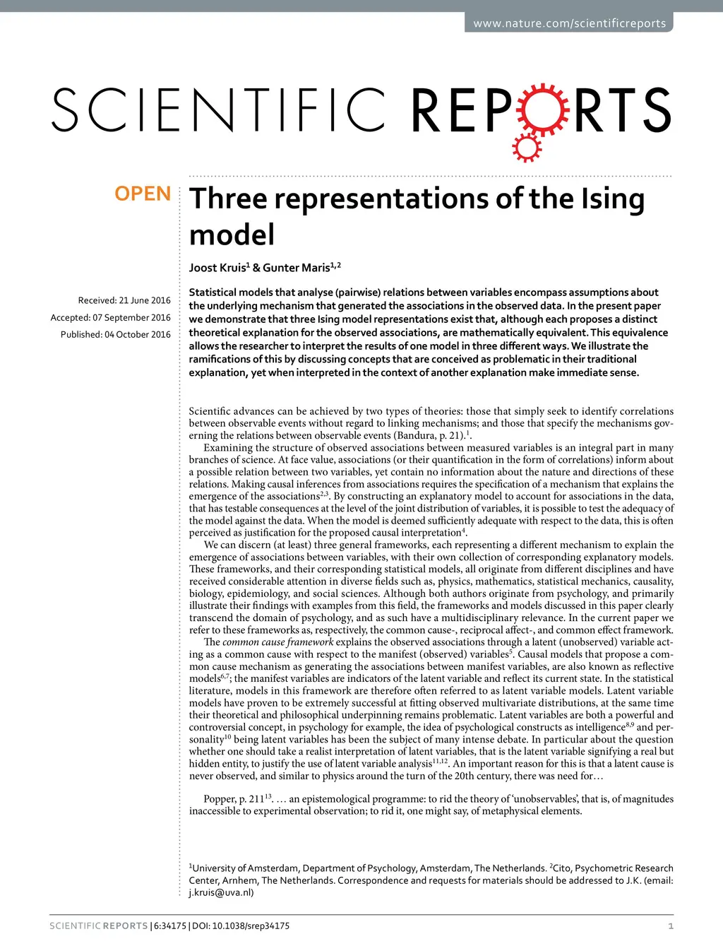 Statistical models that analyse (pairwise) relations between variables encompass assumptions about the underlying mechanism that generated the associations in the observed data. In the present paper we demonstrate that three Ising model representations exist that, although each proposes a distinct theoretical explanation for the observed associations, are mathematically equivalent. This equivalence allows the researcher to interpret the results of one model in three different ways. We illustrate the ramifications of this by discussing concepts that are conceived as problematic in their traditional explanation, yet when interpreted in the context of another explanation make immediate sense.