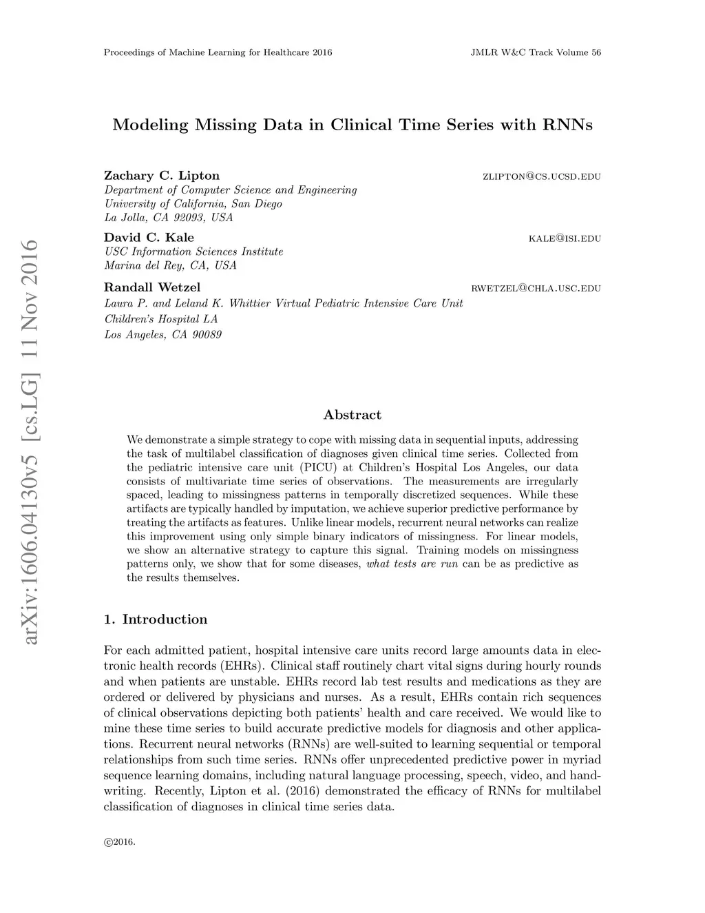 We demonstrate a simple strategy to cope with missing data in sequential inputs, addressing the task of multilabel classification of diagnoses given clinical time series. Collected from the pediatric intensive care unit (PICU) at Children's Hospital Los Angeles, our data consists of multivariate time series of observations. The measurements are irregularly spaced, leading to missingness patterns in temporally discretized sequences. While these artifacts are typically handled by imputation, we achieve superior predictive performance by treating the artifacts as features. Unlike linear models, recurrent neural networks can realize this improvement using only simple binary indicators of missingness. For linear models, we show an alternative strategy to capture this signal. Training models on missingness patterns only, we show that for some diseases, what tests are run can be as predictive as the results themselves.