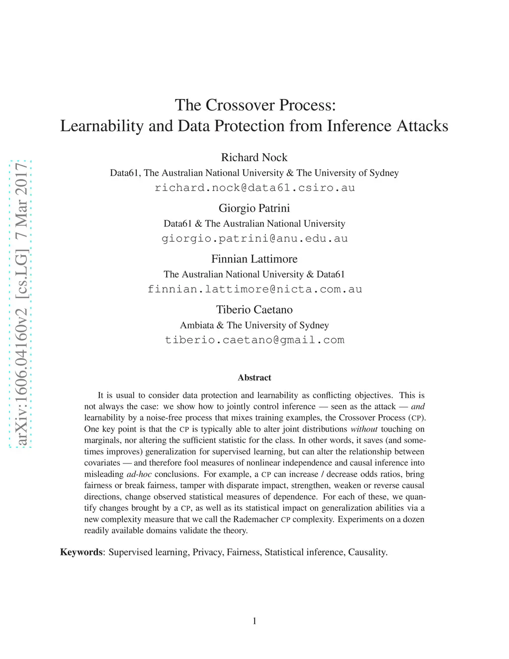 It is usual to consider data protection and learnability as conflicting objectives. This is not always the case: we show how to jointly control inference --- seen as the attack --- and learnability by a noise-free process that mixes training examples, the Crossover Process (cp). One key point is that the cp~is typically able to alter joint distributions without touching on marginals, nor altering the sufficient statistic for the class. In other words, it saves (and sometimes improves) generalization for supervised learning, but can alter the relationship between covariates --- and therefore fool measures of nonlinear independence and causal inference into misleading ad-hoc conclusions. For example, a cp~can increase / decrease odds ratios, bring fairness or break fairness, tamper with disparate impact, strengthen, weaken or reverse causal directions, change observed statistical measures of dependence. For each of these, we quantify changes brought by a cp, as well as its statistical impact on generalization abilities via a new complexity measure that we call the Rademacher cp~complexity. Experiments on a dozen readily available domains validate the theory.