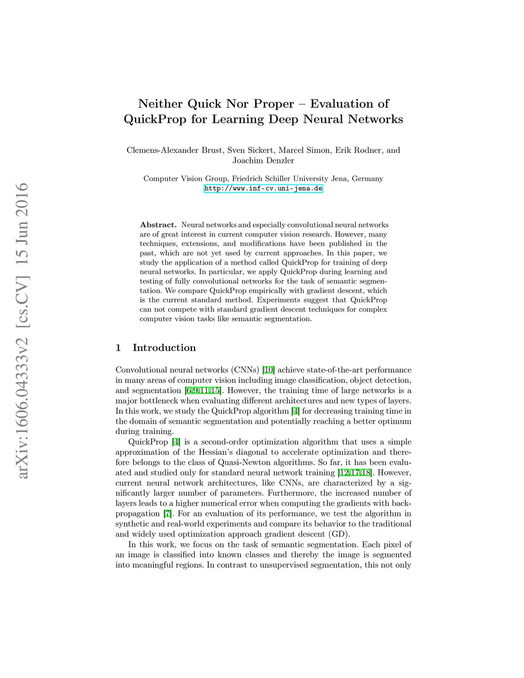 Neural networks and especially convolutional neural networks are of great interest in current computer vision research. However, many techniques, extensions, and modifications have been published in the past, which are not yet used by current approaches. In this paper, we study the application of a method called QuickProp for training of deep neural networks. In particular, we apply QuickProp during learning and testing of fully convolutional networks for the task of semantic segmentation. We compare QuickProp empirically with gradient descent, which is the current standard method. Experiments suggest that QuickProp can not compete with standard gradient descent techniques for complex computer vision tasks like semantic segmentation.