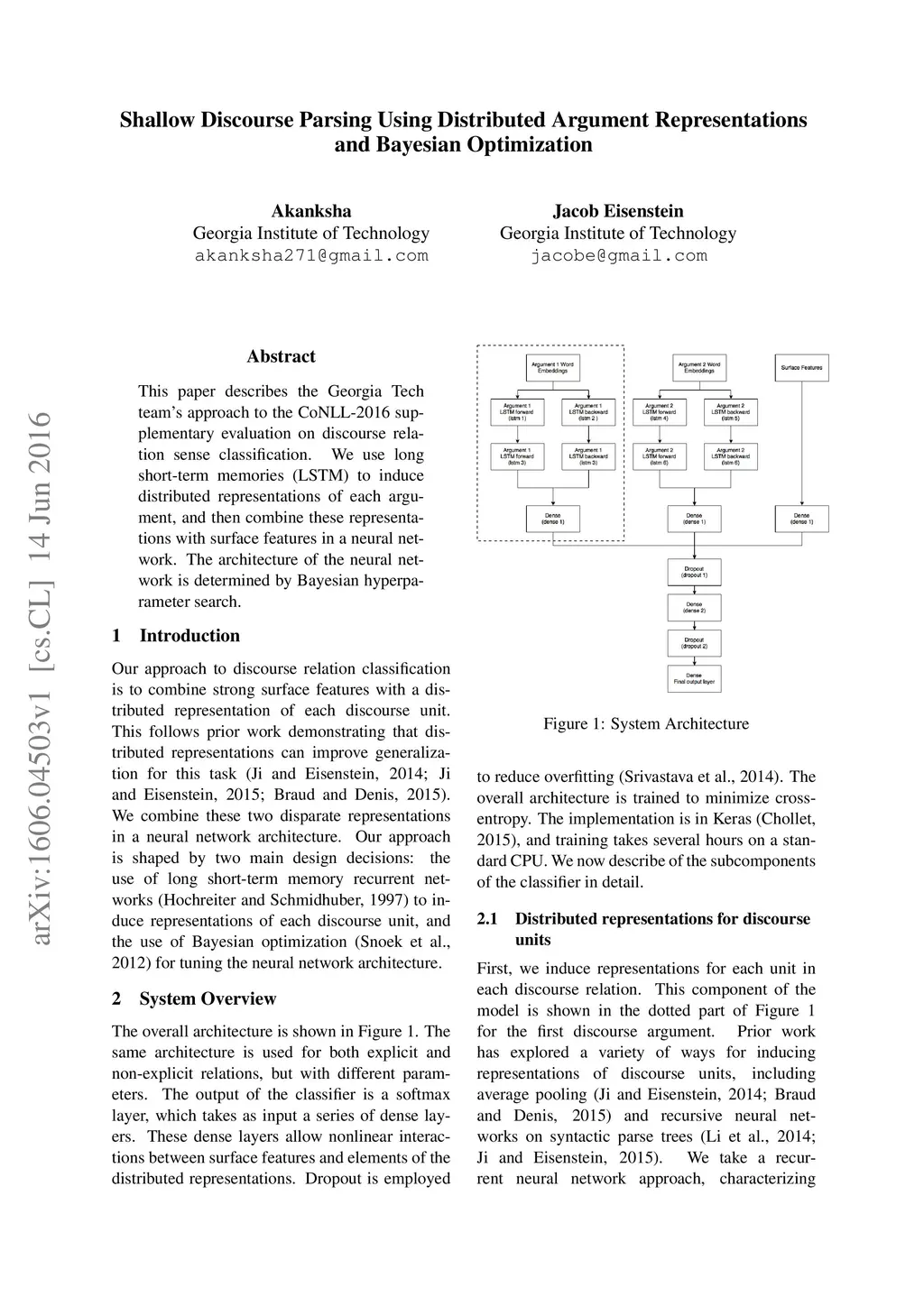 This paper describes the Georgia Tech team's approach to the CoNLL-2016 supplementary evaluation on discourse relation sense classification. We use long short-term memories (LSTM) to induce distributed representations of each argument, and then combine these representations with surface features in a neural network. The architecture of the neural network is determined by Bayesian hyperparameter search.
