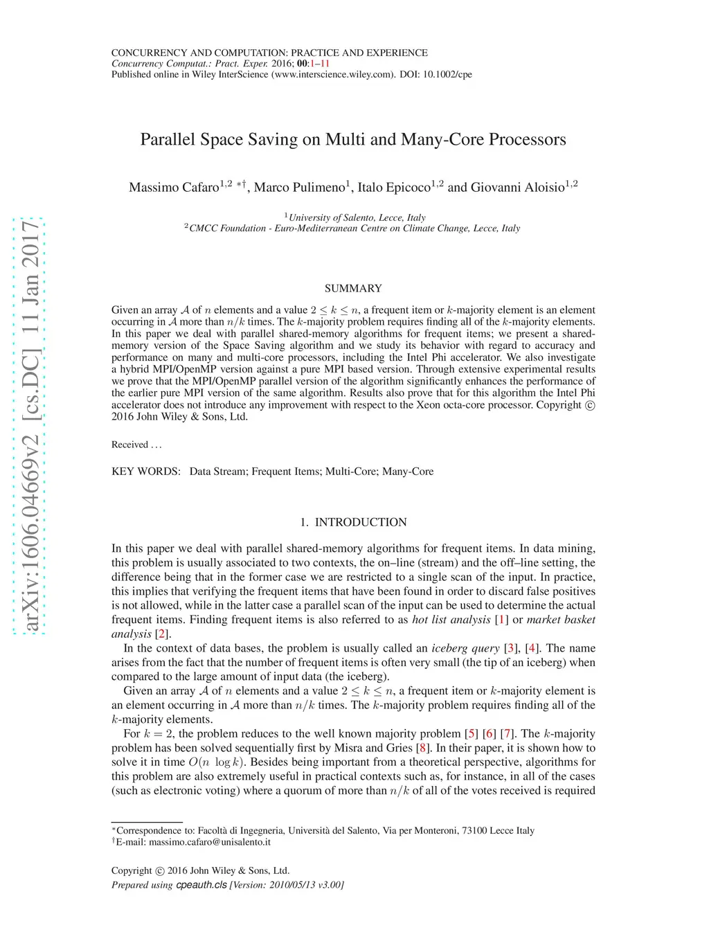 Given an array of elements and a value , a frequent item or -majority element is an element occurring in more than times. The -majority problem requires finding all of the -majority elements. In this paper we deal with parallel shared-memory algorithms for frequent items; we present a shared-memory version of the Space Saving algorithm and we study its behavior with regard to accuracy and performance on many and multi-core processors, including the Intel Phi accelerator. We also investigate a hybrid MPI/OpenMP version against a pure MPI based version. Through extensive experimental results we prove that the MPI/OpenMP parallel version of the algorithm significantly enhances the performance of the earlier pure MPI version of the same algorithm. Results also prove that for this algorithm the Intel Phi accelerator does not introduce any improvement with respect to the Xeon octa-core processor.