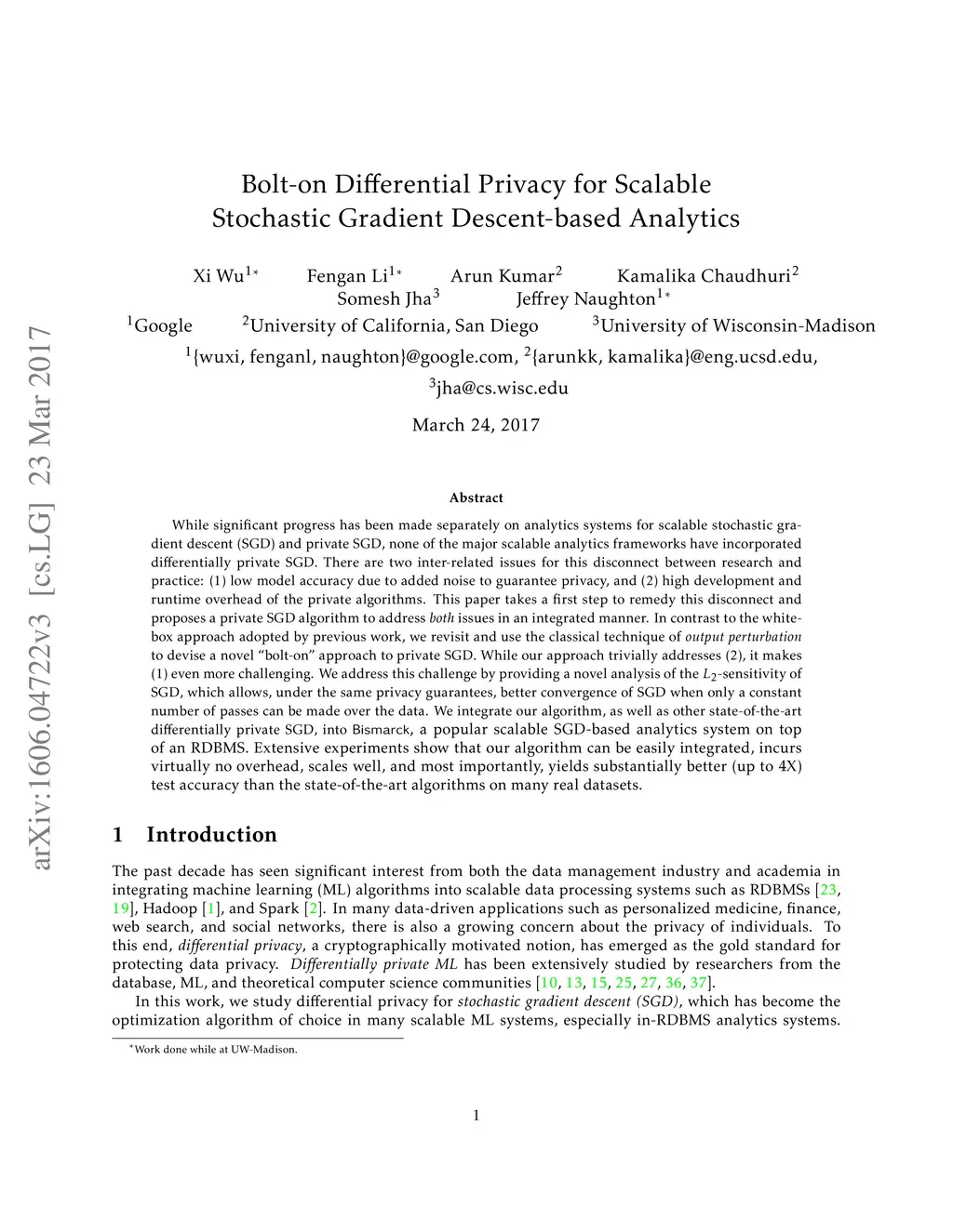 While significant progress has been made separately on analytics systems for scalable stochastic gradient descent (SGD) and private SGD, none of the major scalable analytics frameworks have incorporated differentially private SGD. There are two inter-related issues for this disconnect between research and practice: (1) low model accuracy due to added noise to guarantee privacy, and (2) high development and runtime overhead of the private algorithms. This paper takes a first step to remedy this disconnect and proposes a private SGD algorithm to address \emph{both} issues in an integrated manner. In contrast to the white-box approach adopted by previous work, we revisit and use the classical technique of {\em output perturbation} to devise a novel "bolt-on" approach to private SGD. While our approach trivially addresses (2), it makes (1) even more challenging. We address this challenge by providing a novel analysis of the -sensitivity of SGD, which allows, under the same privacy guarantees, better convergence of SGD when only a constant number of passes can be made over the data. We integrate our algorithm, as well as other state-of-the-art differentially private SGD, into Bismarck, a popular scalable SGD-based analytics system on top of an RDBMS. Extensive experiments show that our algorithm can be easily integrated, incurs virtually no overhead, scales well, and most importantly, yields substantially better (up to 4X) test accuracy than the state-of-the-art algorithms on many real datasets.