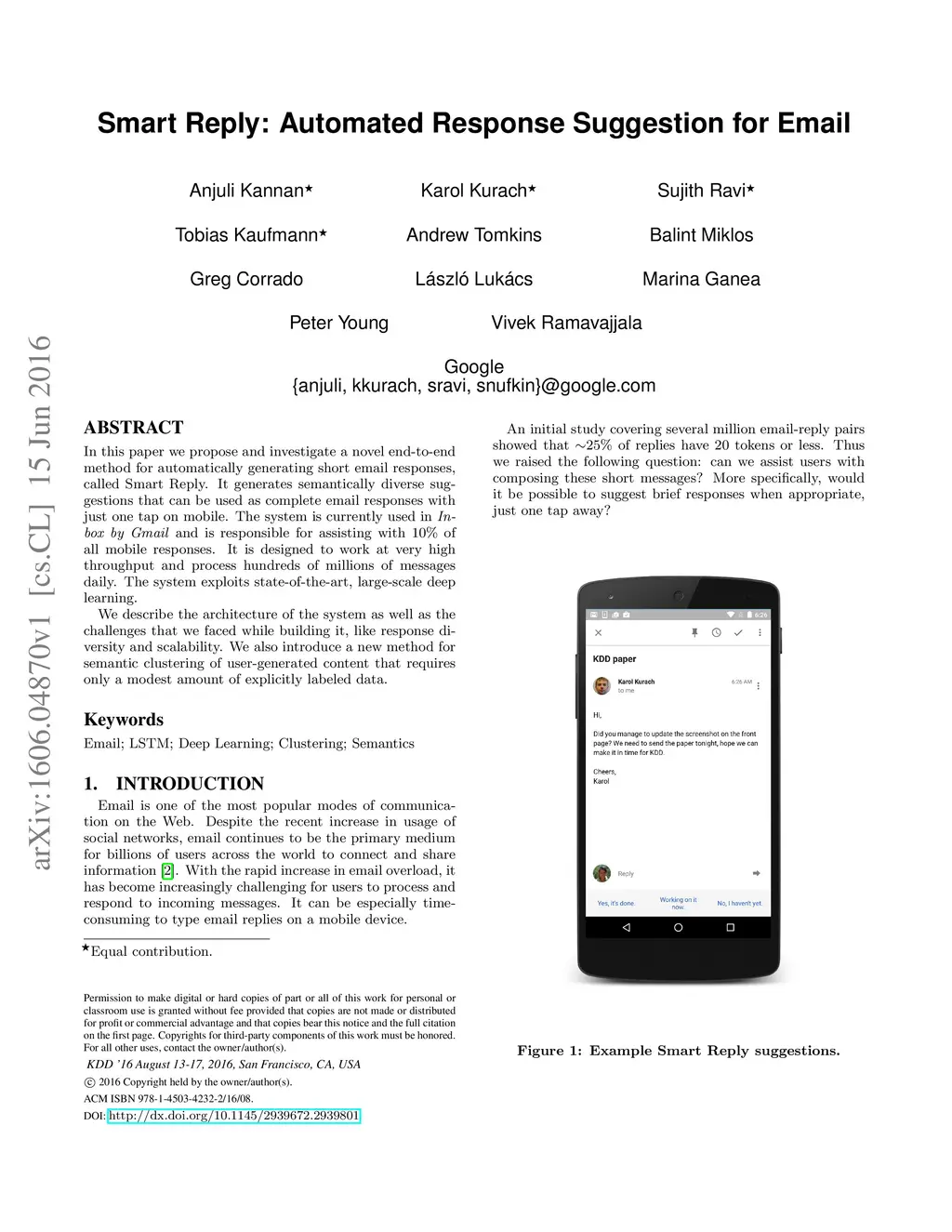 In this paper we propose and investigate a novel end-to-end method for automatically generating short email responses, called Smart Reply. It generates semantically diverse suggestions that can be used as complete email responses with just one tap on mobile. The system is currently used in Inbox by Gmail and is responsible for assisting with 10% of all mobile responses. It is designed to work at very high throughput and process hundreds of millions of messages daily. The system exploits state-of-the-art, large-scale deep learning. We describe the architecture of the system as well as the challenges that we faced while building it, like response diversity and scalability. We also introduce a new method for semantic clustering of user-generated content that requires only a modest amount of explicitly labeled data.
