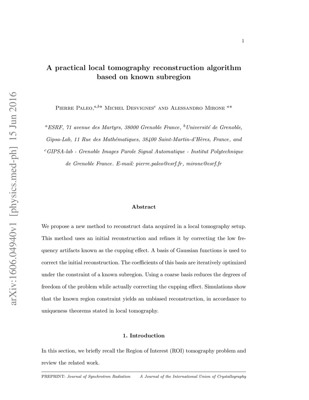 We propose a new method to reconstruct data acquired in a local tomography setup. This method uses an initial reconstruction and refines it by correcting the low frequency artifacts known as the cupping effect. A basis of Gaussian functions is used to correct the initial reconstruction. The coefficients of this basis are iteratively optimized under the constraint of a known subregion. Using a coarse basis reduces the degrees of freedom of the problem while actually correcting the cupping effect. Simulations show that the known region constraint yields an unbiased reconstruction, in accordance to uniqueness theorems stated in local tomography.