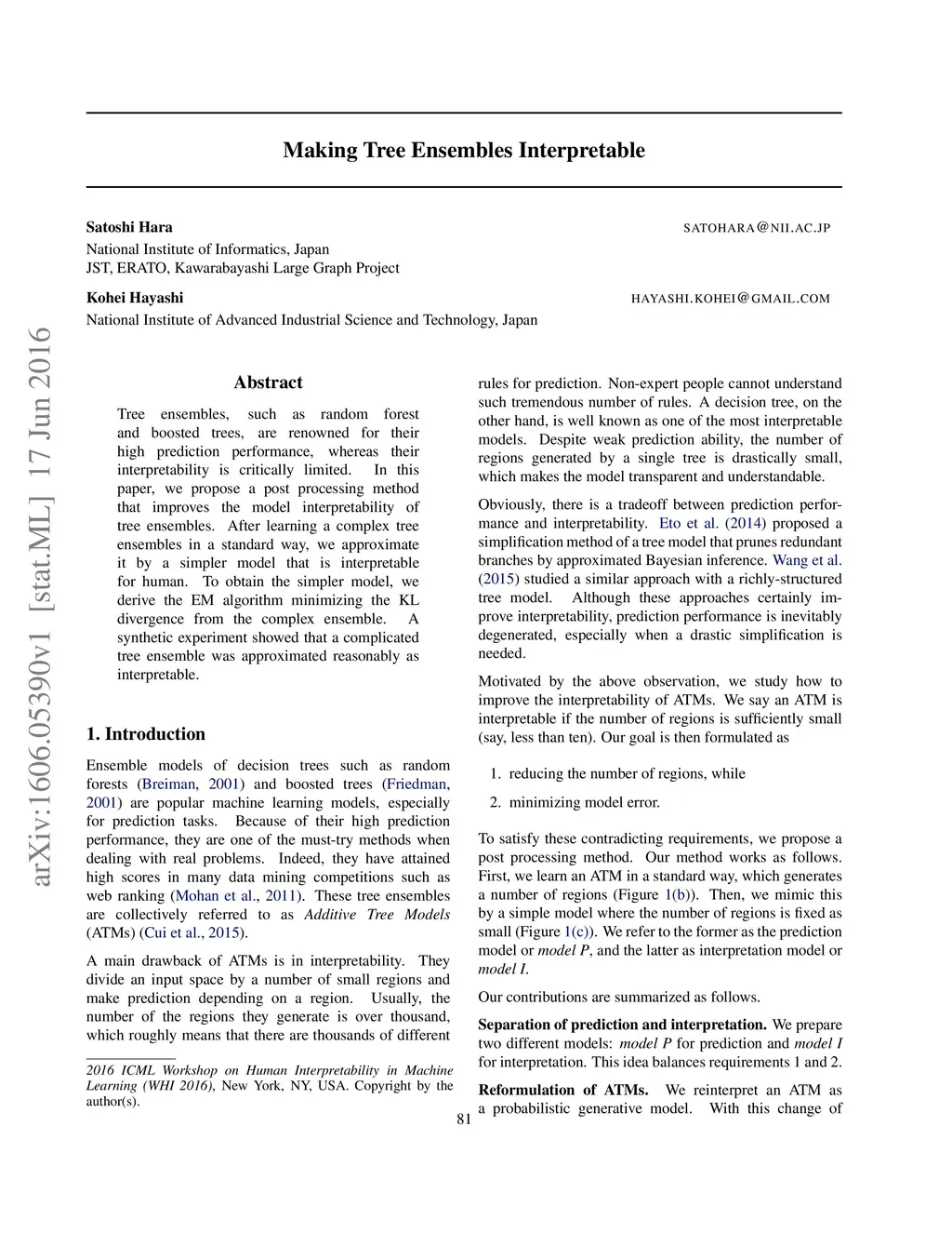 Tree ensembles, such as random forest and boosted trees, are renowned for their high prediction performance, whereas their interpretability is critically limited. In this paper, we propose a post processing method that improves the model interpretability of tree ensembles. After learning a complex tree ensembles in a standard way, we approximate it by a simpler model that is interpretable for human. To obtain the simpler model, we derive the EM algorithm minimizing the KL divergence from the complex ensemble. A synthetic experiment showed that a complicated tree ensemble was approximated reasonably as interpretable.