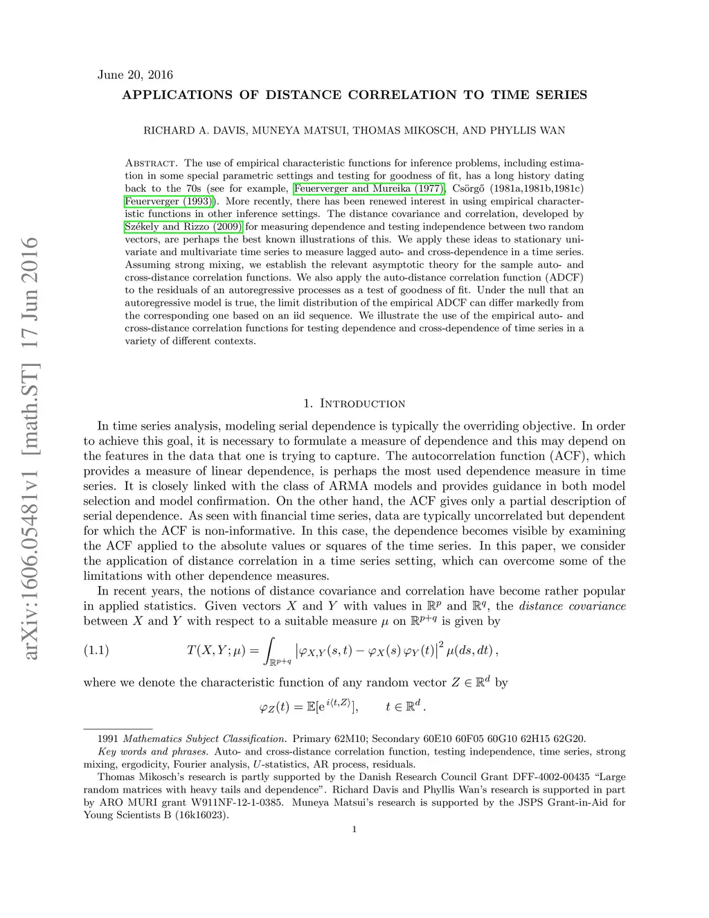 The use of empirical characteristic functions for inference problems, including estimation in some special parametric settings and testing for goodness of fit, has a long history dating back to the 70s (see for example, Feuerverger and Mureika (1977), Csorgo (1981a,1981b,1981c), Feuerverger (1993)). More recently, there has been renewed interest in using empirical characteristic functions in other inference settings. The distance covariance and correlation, developed by Szekely and Rizzo (2009) for measuring dependence and testing independence between two random vectors, are perhaps the best known illustrations of this. We apply these ideas to stationary univariate and multivariate time series to measure lagged auto- and cross-dependence in a time series. Assuming strong mixing, we establish the relevant asymptotic theory for the sample auto- and cross-distance correlation functions. We also apply the auto-distance correlation function (ADCF) to the residuals of an autoregressive processes as a test of goodness of fit. Under the null that an autoregressive model is true, the limit distribution of the empirical ADCF can differ markedly from the corresponding one based on an iid sequence. We illustrate the use of the empirical auto- and cross-distance correlation functions for testing dependence and cross-dependence of time series in a variety of different contexts.