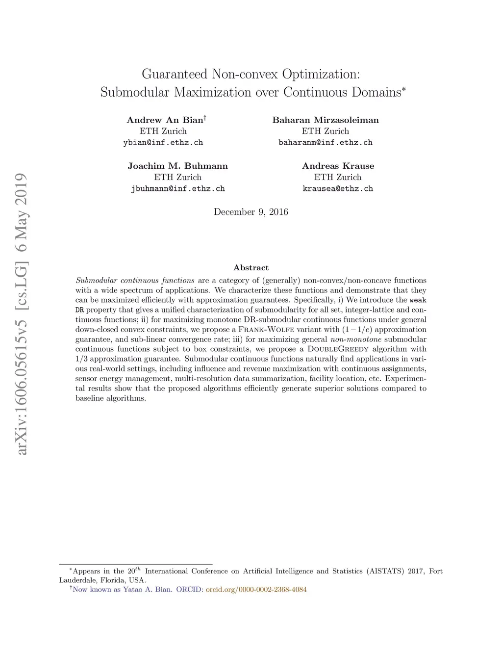 Submodular continuous functions are a category of (generally) non-convex/non-concave functions with a wide spectrum of applications. We characterize these functions and demonstrate that they can be maximized efficiently with approximation guarantees. Specifically, i) We introduce the weak DR property that gives a unified characterization of submodularity for all set, integer-lattice and continuous functions; ii) for maximizing monotone DR-submodular continuous functions under general down-closed convex constraints, we propose a Frank-Wolfe variant with approximation guarantee, and sub-linear convergence rate; iii) for maximizing general non-monotone submodular continuous functions subject to box constraints, we propose a DoubleGreedy algorithm with approximation guarantee. Submodular continuous functions naturally find applications in various real-world settings, including influence and revenue maximization with continuous assignments, sensor energy management, multi-resolution data summarization, facility location, etc. Experimental results show that the proposed algorithms efficiently generate superior solutions compared to baseline algorithms.