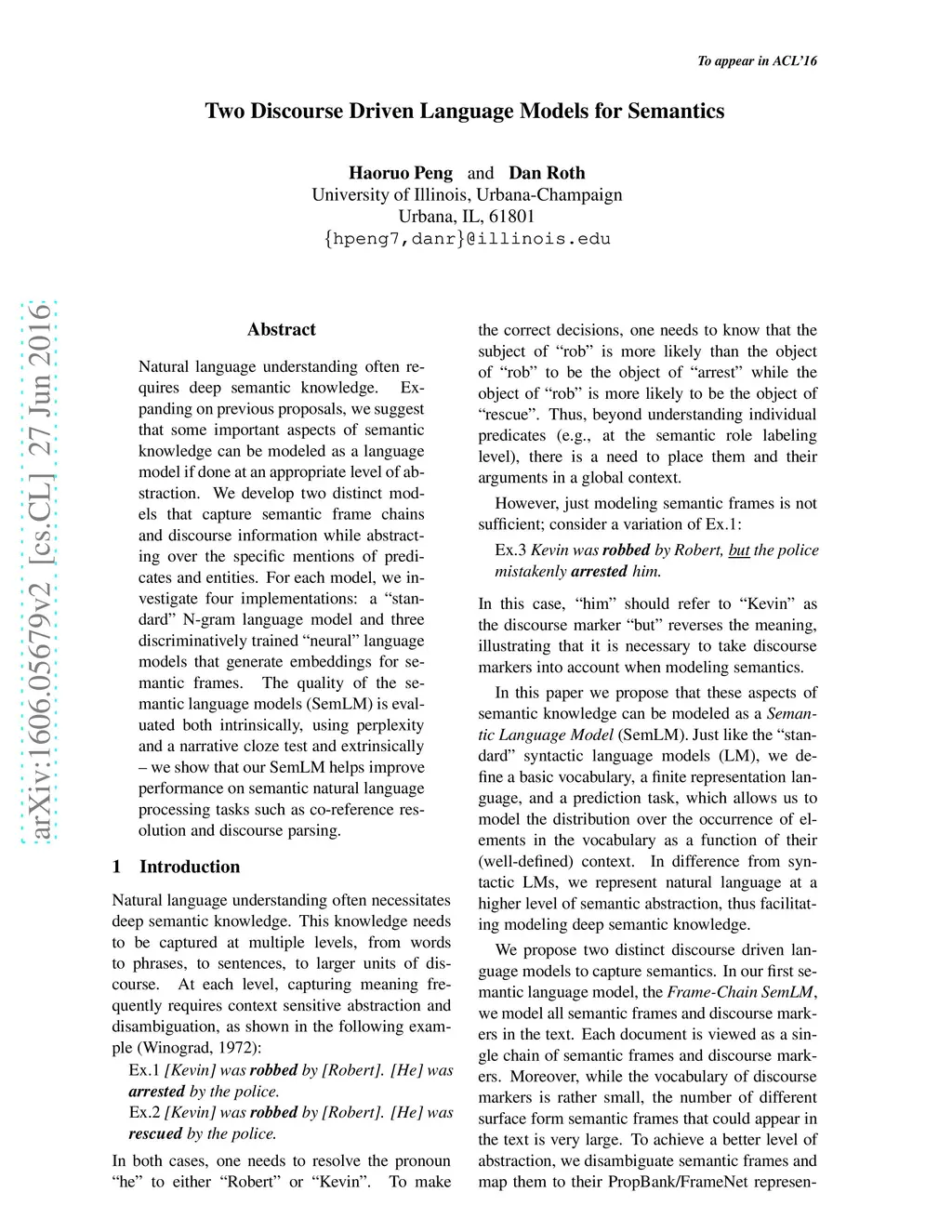 Natural language understanding often requires deep semantic knowledge. Expanding on previous proposals, we suggest that some important aspects of semantic knowledge can be modeled as a language model if done at an appropriate level of abstraction. We develop two distinct models that capture semantic frame chains and discourse information while abstracting over the specific mentions of predicates and entities. For each model, we investigate four implementations: a "standard" N-gram language model and three discriminatively trained "neural" language models that generate embeddings for semantic frames. The quality of the semantic language models (SemLM) is evaluated both intrinsically, using perplexity and a narrative cloze test and extrinsically - we show that our SemLM helps improve performance on semantic natural language processing tasks such as co-reference resolution and discourse parsing.