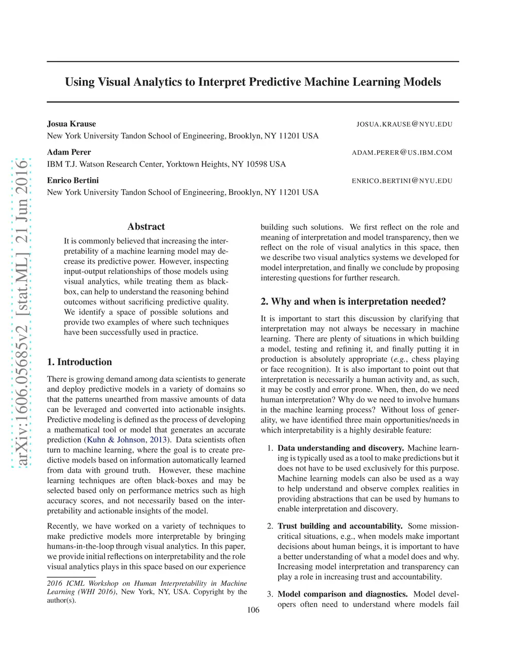 It is commonly believed that increasing the interpretability of a machine learning model may decrease its predictive power. However, inspecting input-output relationships of those models using visual analytics, while treating them as black-box, can help to understand the reasoning behind outcomes without sacrificing predictive quality. We identify a space of possible solutions and provide two examples of where such techniques have been successfully used in practice.