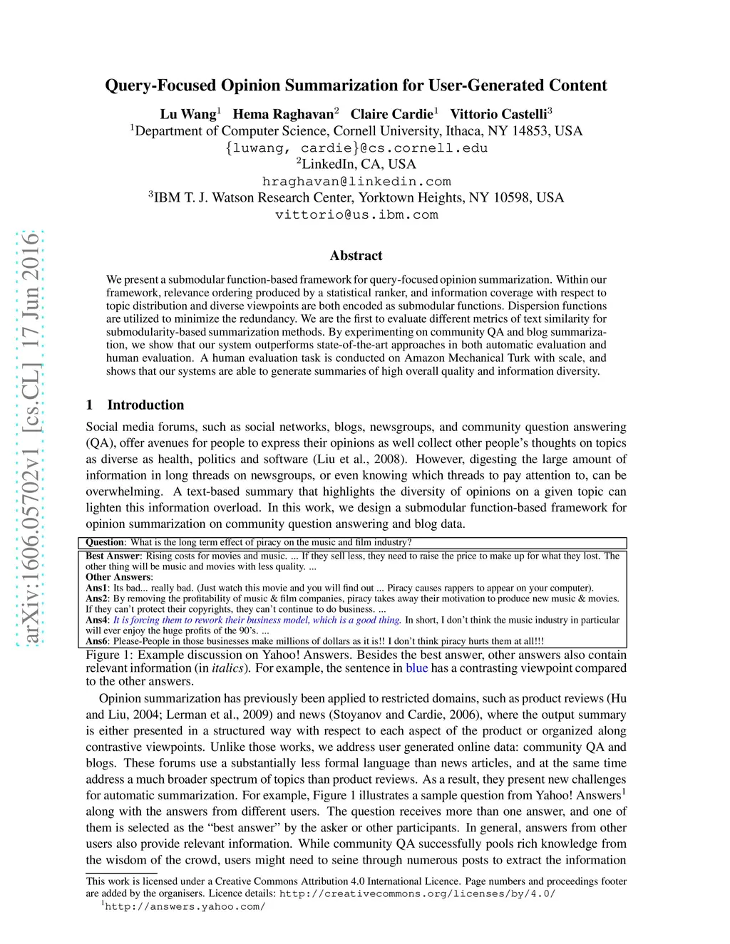 We present a submodular function-based framework for query-focused opinion summarization. Within our framework, relevance ordering produced by a statistical ranker, and information coverage with respect to topic distribution and diverse viewpoints are both encoded as submodular functions. Dispersion functions are utilized to minimize the redundancy. We are the first to evaluate different metrics of text similarity for submodularity-based summarization methods. By experimenting on community QA and blog summarization, we show that our system outperforms state-of-the-art approaches in both automatic evaluation and human evaluation. A human evaluation task is conducted on Amazon Mechanical Turk with scale, and shows that our systems are able to generate summaries of high overall quality and information diversity.