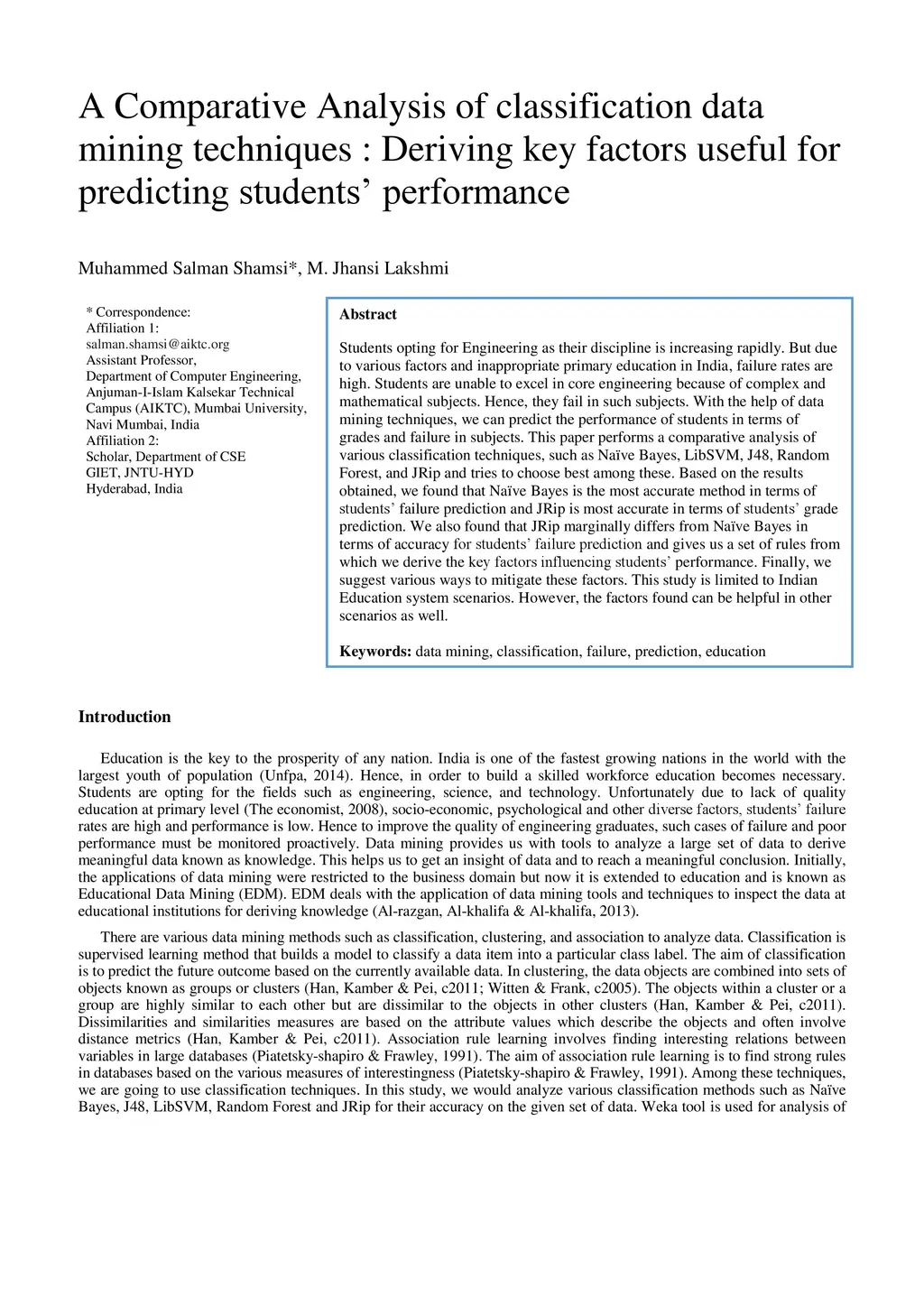 Students opting for Engineering as their discipline is increasing rapidly. But due to various factors and inappropriate primary education in India, failure rates are high. Students are unable to excel in core engineering because of complex and mathematical subjects. Hence, they fail in such subjects. With the help of data mining techniques, we can predict the performance of students in terms of grades and failure in subjects. This paper performs a comparative analysis of various classification techniques, such as Na\"ive Bayes, LibSVM, J48, Random Forest, and JRip and tries to choose best among these. Based on the results obtained, we found that Na\"ive Bayes is the most accurate method in terms of students failure prediction and JRip is most accurate in terms of students grade prediction. We also found that JRip marginally differs from Na\"ive Bayes in terms of accuracy for students failure prediction and gives us a set of rules from which we derive the key factors influencing students performance. Finally, we suggest various ways to mitigate these factors. This study is limited to Indian Education system scenarios. However, the factors found can be helpful in other scenarios as well.