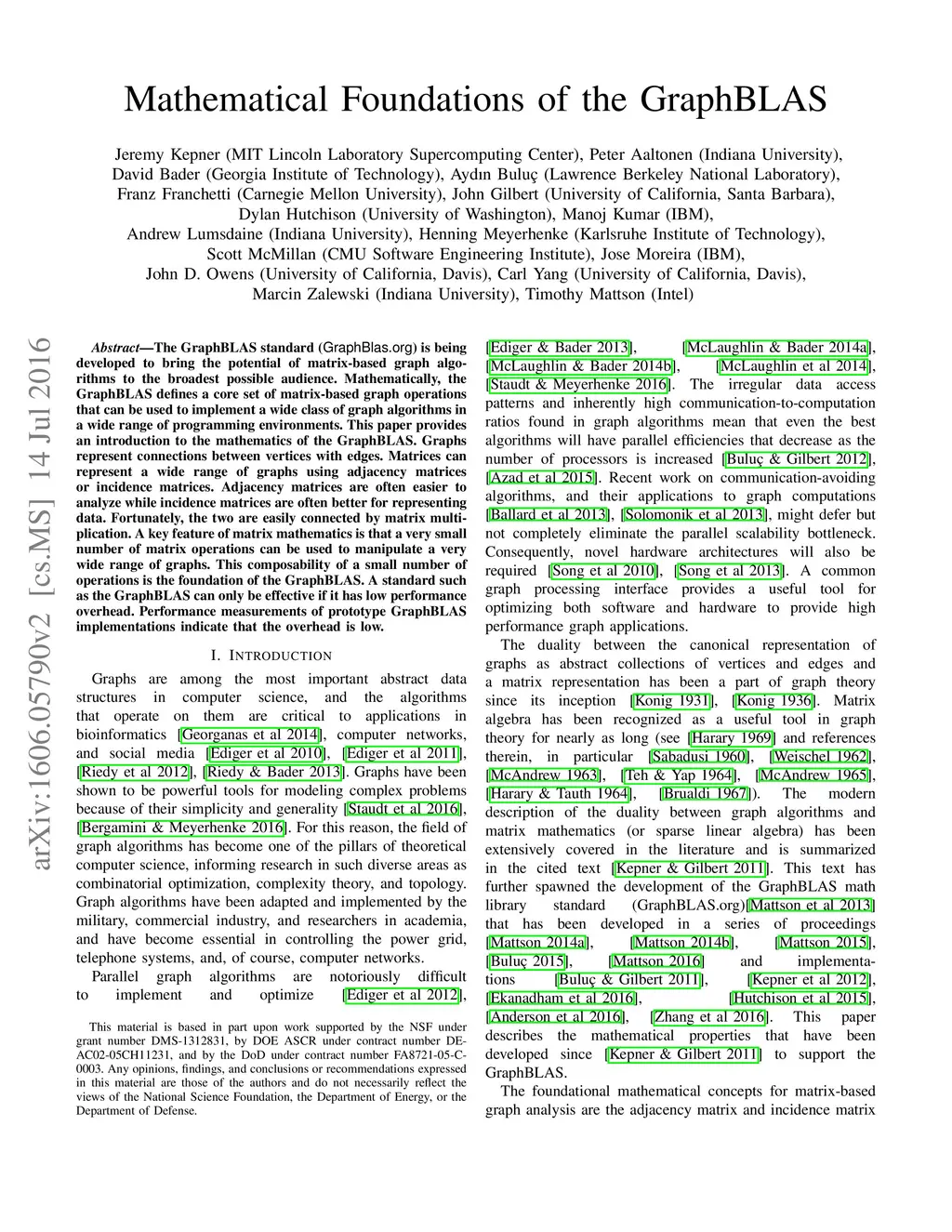 The GraphBLAS standard (GraphBlas.org) is being developed to bring the potential of matrix based graph algorithms to the broadest possible audience. Mathematically the Graph- BLAS defines a core set of matrix-based graph operations that can be used to implement a wide class of graph algorithms in a wide range of programming environments. This paper provides an introduction to the mathematics of the GraphBLAS. Graphs represent connections between vertices with edges. Matrices can represent a wide range of graphs using adjacency matrices or incidence matrices. Adjacency matrices are often easier to analyze while incidence matrices are often better for representing data. Fortunately, the two are easily connected by matrix mul- tiplication. A key feature of matrix mathematics is that a very small number of matrix operations can be used to manipulate a very wide range of graphs. This composability of small number of operations is the foundation of the GraphBLAS. A standard such as the GraphBLAS can only be effective if it has low performance overhead. Performance measurements of prototype GraphBLAS implementations indicate that the overhead is low.