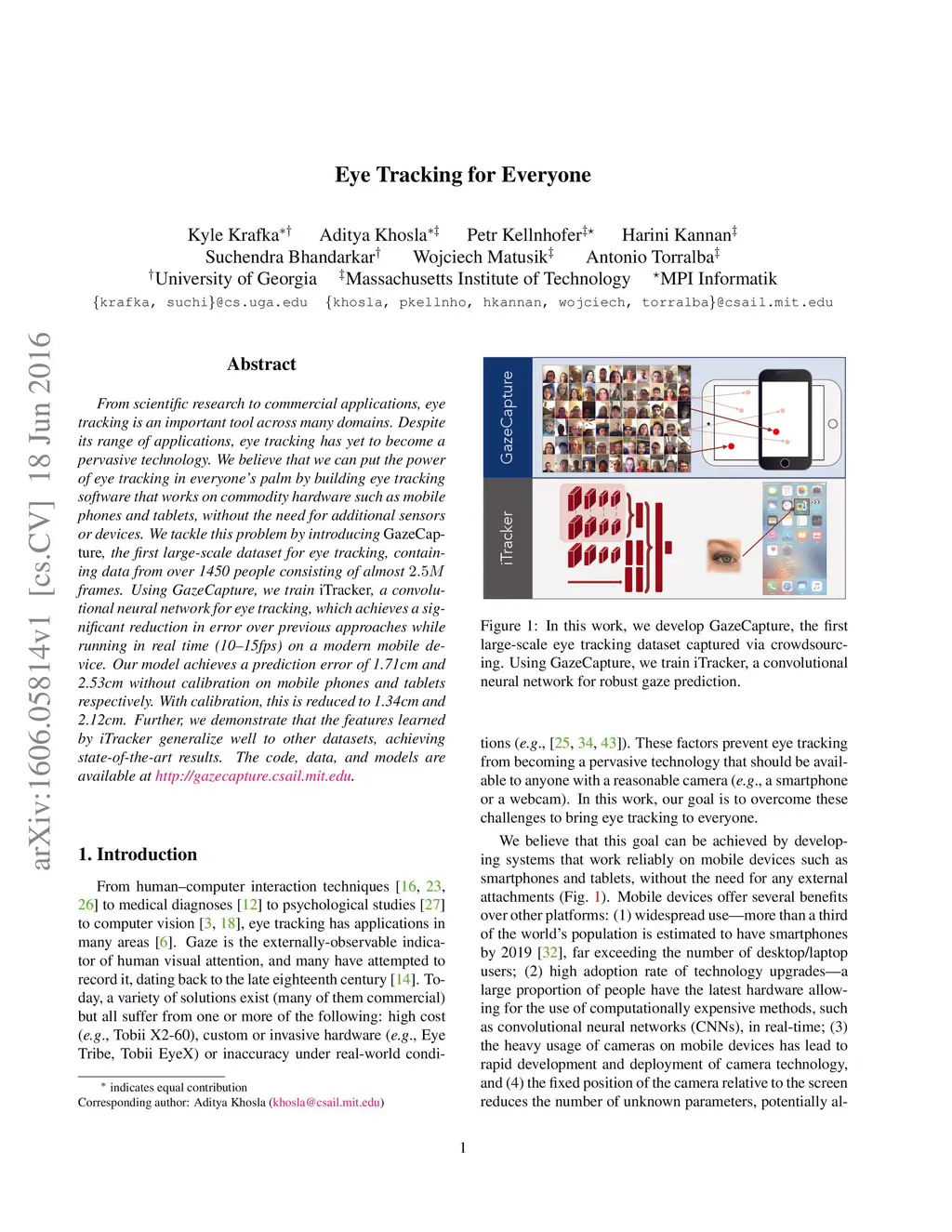 From scientific research to commercial applications, eye tracking is an important tool across many domains. Despite its range of applications, eye tracking has yet to become a pervasive technology. We believe that we can put the power of eye tracking in everyone's palm by building eye tracking software that works on commodity hardware such as mobile phones and tablets, without the need for additional sensors or devices. We tackle this problem by introducing GazeCapture, the first large-scale dataset for eye tracking, containing data from over 1450 people consisting of almost 2.5M frames. Using GazeCapture, we train iTracker, a convolutional neural network for eye tracking, which achieves a significant reduction in error over previous approaches while running in real time (10-15fps) on a modern mobile device. Our model achieves a prediction error of 1.71cm and 2.53cm without calibration on mobile phones and tablets respectively. With calibration, this is reduced to 1.34cm and 2.12cm. Further, we demonstrate that the features learned by iTracker generalize well to other datasets, achieving state-of-the-art results. The code, data, and models are available at http://gazecapture.csail.mit.edu.