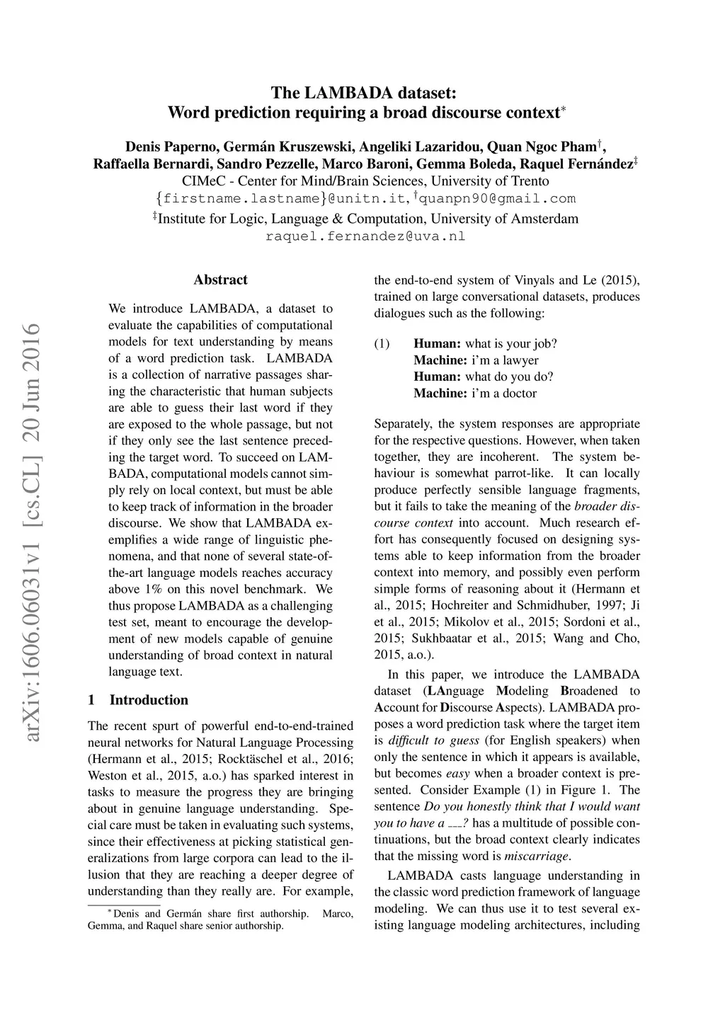 The LAMBADA dataset: Word prediction requiring a broad discourse context