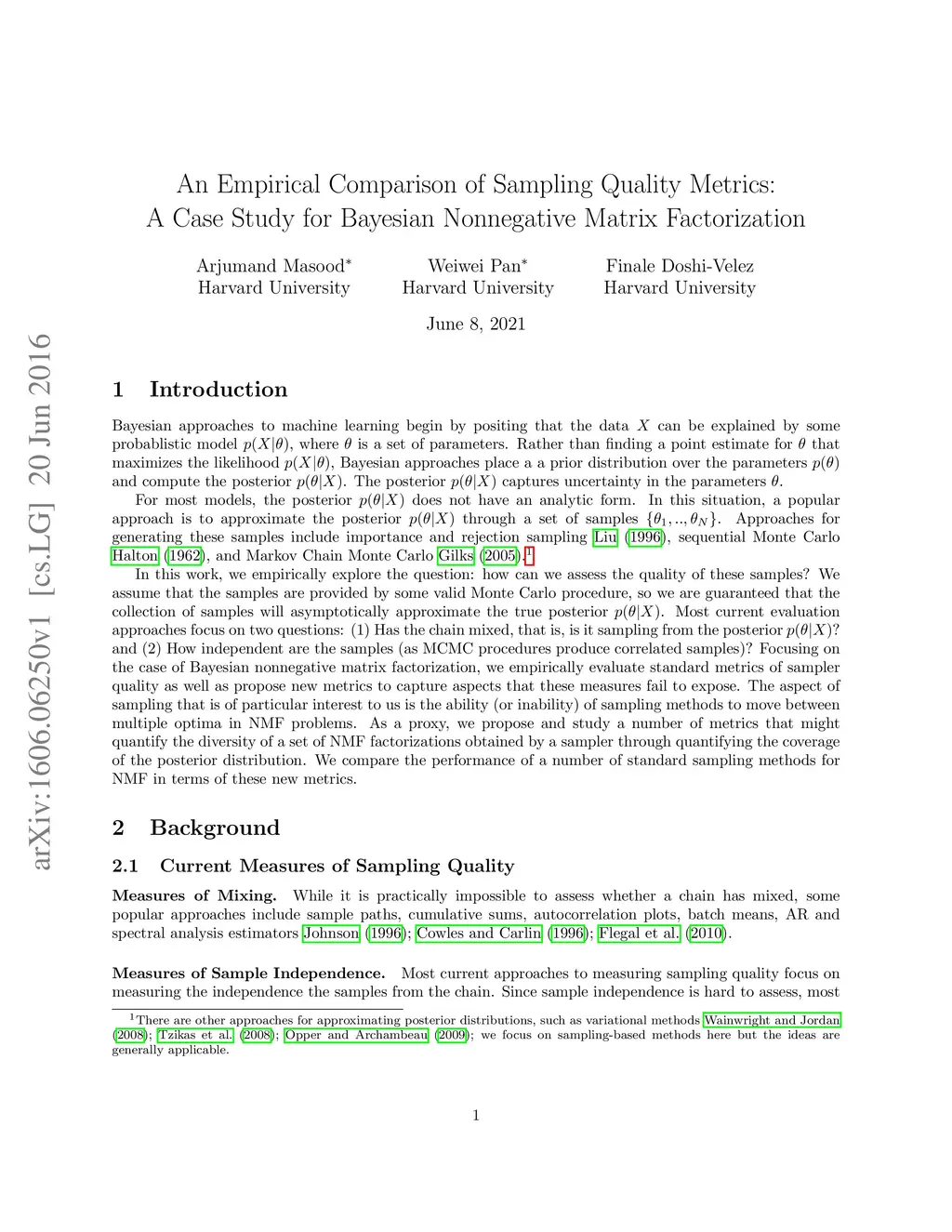 In this work, we empirically explore the question: how can we assess the quality of samples from some target distribution? We assume that the samples are provided by some valid Monte Carlo procedure, so we are guaranteed that the collection of samples will asymptotically approximate the true distribution. Most current evaluation approaches focus on two questions: (1) Has the chain mixed, that is, is it sampling from the distribution? and (2) How independent are the samples (as MCMC procedures produce correlated samples)? Focusing on the case of Bayesian nonnegative matrix factorization, we empirically evaluate standard metrics of sampler quality as well as propose new metrics to capture aspects that these measures fail to expose. The aspect of sampling that is of particular interest to us is the ability (or inability) of sampling methods to move between multiple optima in NMF problems. As a proxy, we propose and study a number of metrics that might quantify the diversity of a set of NMF factorizations obtained by a sampler through quantifying the coverage of the posterior distribution. We compare the performance of a number of standard sampling methods for NMF in terms of these new metrics.