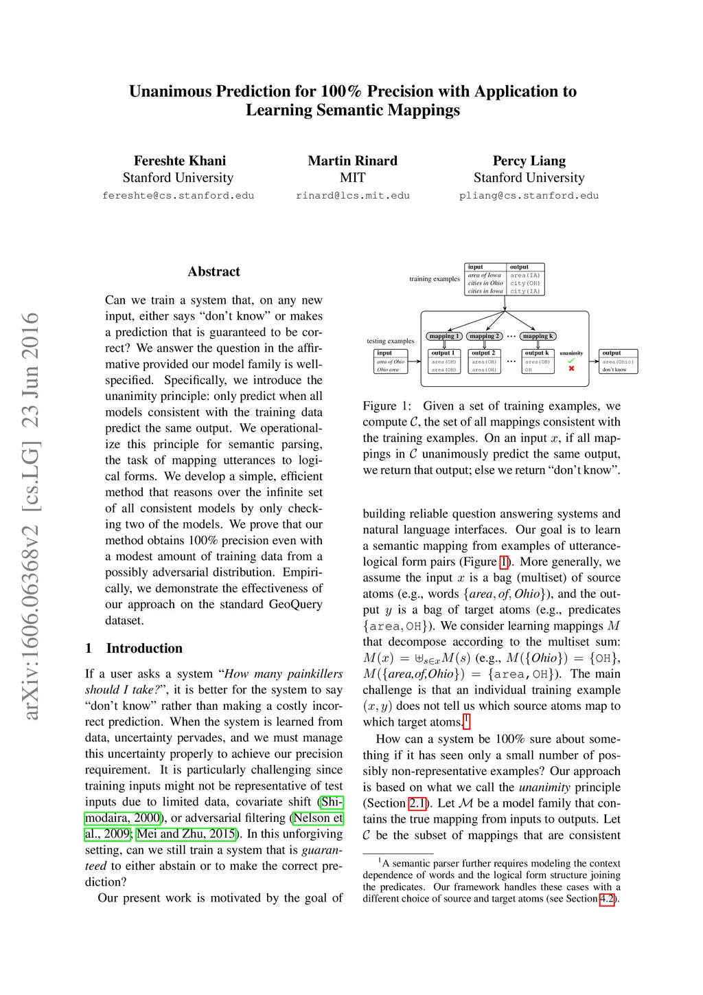 Can we train a system that, on any new input, either says "don't know" or makes a prediction that is guaranteed to be correct? We answer the question in the affirmative provided our model family is well-specified. Specifically, we introduce the unanimity principle: only predict when all models consistent with the training data predict the same output. We operationalize this principle for semantic parsing, the task of mapping utterances to logical forms. We develop a simple, efficient method that reasons over the infinite set of all consistent models by only checking two of the models. We prove that our method obtains 100% precision even with a modest amount of training data from a possibly adversarial distribution. Empirically, we demonstrate the effectiveness of our approach on the standard GeoQuery dataset.