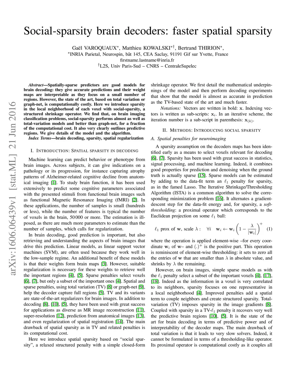 Spatially-sparse predictors are good models for brain decoding: they give accurate predictions and their weight maps are interpretable as they focus on a small number of regions. However, the state of the art, based on total variation or graph-net, is computationally costly. Here we introduce sparsity in the local neighborhood of each voxel with social-sparsity, a structured shrinkage operator. We find that, on brain imaging classification problems, social-sparsity performs almost as well as total-variation models and better than graph-net, for a fraction of the computational cost. It also very clearly outlines predictive regions. We give details of the model and the algorithm.